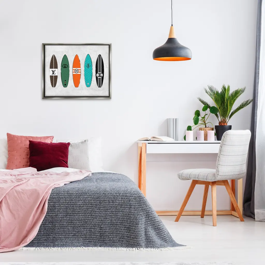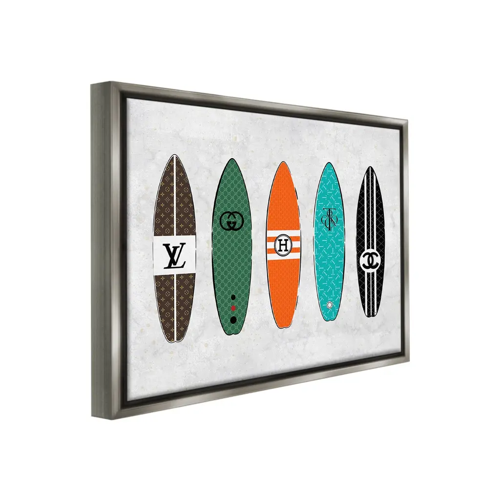 Elevate your home or office to the next level with Stupell Framed Floating Canvas Wall Art. Our premium hand-stretched canvas is mounted securely into a sturdy lightweight frame. The museum-style gap between the wrapped canvas and the box frame gives the illusion of floating artwork. Stupell Wall Art is made in the USA.Features: Dimensions: 21 x 1.7 x 17 Frame, 20 x 1.5 x 16 Canvas ArtFloating Frame Canvas Products are available in sizes 21"x17" and 31"x25". All Floating Frame Canvas Products have a 1.7" Depth.Wall Art is Ready to Hang with Hardware Free Hanging. No Installation required. For Easy Set Up Lean or Layer Artwork on Shelf or Against Wall. Artwork is Permently Fixed into the Frame.Our elevated 1.7" Thick Floating Frame is the perfect complement to our canvas style Wall Art. We use only the highest quality inks in house with industry leading printing solutions. Canvas is hand stretched over a durable wood foundation and then mounted securly into a Modern Box Frame. Made in the USA.Artwork Relates To: Glam, Fashion, Pattern, Surf, Nautical, Surfboard, LogoDesign by Martina Pavlova