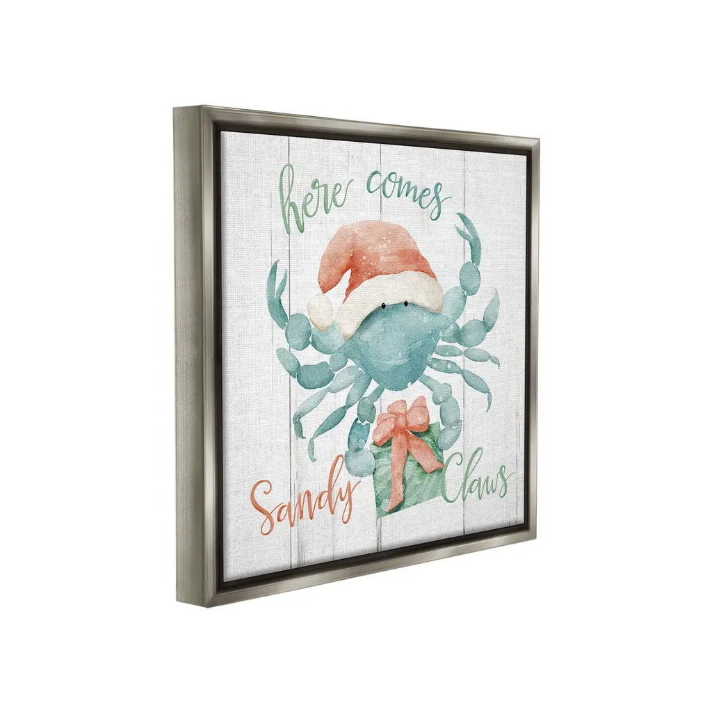 Elevate your home or office to the next level with Stupell Framed Floating Canvas Wall Art. Our premium hand-stretched canvas is mounted securely into a sturdy lightweight frame. The museum-style gap between the wrapped canvas and the box frame gives the illusion of floating artwork. Stupell Wall Art is made in the USA.Features: Dimensions: 18 x 1.7 x 18 Frame, 17 x 1.5 x 17 Canvas ArtFloating Frame Canvas Products are available in sizes 18"x18" and 25"x25". All Floating Frame Canvas Products have a 1.7" Depth.Wall Art is Ready to Hang with Hardware Free Hanging. No Installation required. For Easy Set Up Lean or Layer Artwork on Shelf or Against Wall. Artwork is Permently Fixed into the Frame.Our elevated 1.7" Thick Floating Frame is the perfect complement to our canvas style Wall Art. We use only the highest quality inks in house with industry leading printing solutions. Canvas is hand stretched over a durable wood foundation and then mounted securly into a Modern Box Frame. Made in the USA.Artwork Relates To: Seafood, Animal, Crab, Invertebrate, Sea Life, Winter, Holiday, Christmas, Santa Claus, Funny, Humor, Nautical, Here Comes Sandy ClawsDesign by Deane Beesley