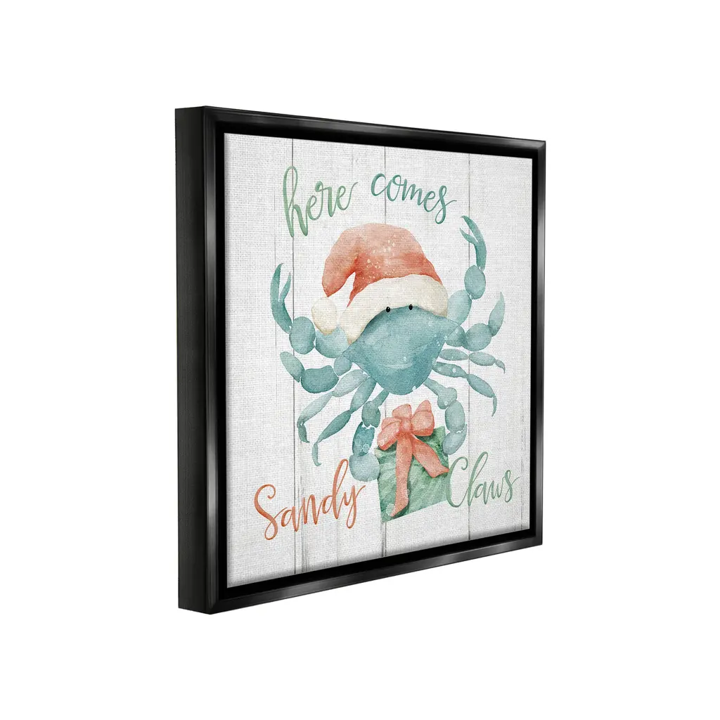 Elevate your home or office to the next level with Stupell Framed Floating Canvas Wall Art. Our premium hand-stretched canvas is mounted securely into a sturdy lightweight frame. The museum-style gap between the wrapped canvas and the box frame gives the illusion of floating artwork. Stupell Wall Art is made in the USA.Features: Dimensions: 18 x 1.7 x 18 Frame, 17 x 1.5 x 17 Canvas ArtFloating Frame Canvas Products are available in sizes 18"x18" and 25"x25". All Floating Frame Canvas Products have a 1.7" Depth.Wall Art is Ready to Hang with Hardware Free Hanging. No Installation required. For Easy Set Up Lean or Layer Artwork on Shelf or Against Wall. Artwork is Permently Fixed into the Frame.Our elevated 1.7" Thick Floating Frame is the perfect complement to our canvas style Wall Art. We use only the highest quality inks in house with industry leading printing solutions. Canvas is hand stretched over a durable wood foundation and then mounted securly into a Modern Box Frame. Made in the USA.Artwork Relates To: Seafood, Animal, Crab, Invertebrate, Sea Life, Winter, Holiday, Christmas, Santa Claus, Funny, Humor, Nautical, Here Comes Sandy ClawsDesign by Deane Beesley