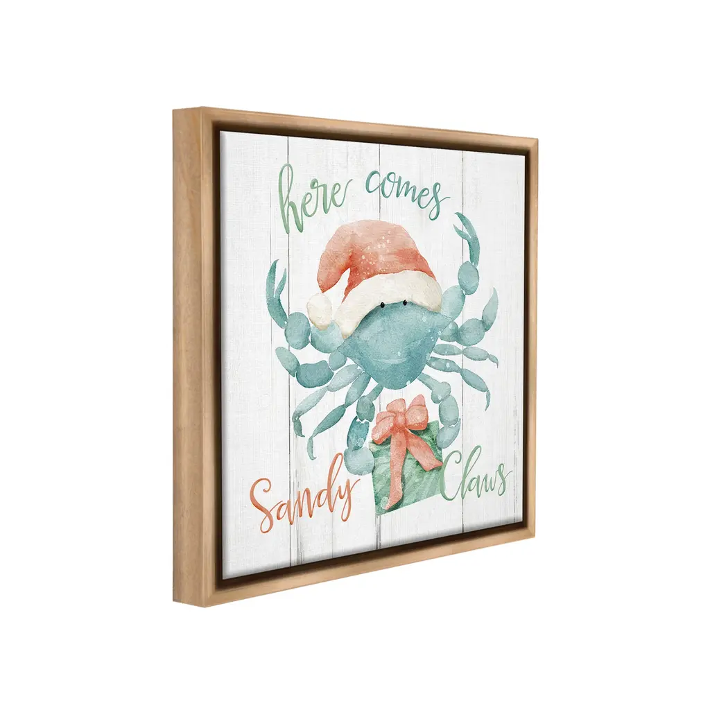 Elevate your home or office to the next level with Stupell Framed Floating Canvas Wall Art. Our premium hand-stretched canvas is mounted securely into a sturdy lightweight frame. The museum-style gap between the wrapped canvas and the box frame gives the illusion of floating artwork. Stupell Wall Art is made in the USA.Features: Dimensions: 18 x 1.7 x 18 Frame, 17 x 1.5 x 17 Canvas ArtFloating Frame Canvas Products are available in sizes 18"x18" and 25"x25". All Floating Frame Canvas Products have a 1.7" Depth.Wall Art is Ready to Hang with Hardware Free Hanging. No Installation required. For Easy Set Up Lean or Layer Artwork on Shelf or Against Wall. Artwork is Permently Fixed into the Frame.Our elevated 1.7" Thick Floating Frame is the perfect complement to our canvas style Wall Art. We use only the highest quality inks in house with industry leading printing solutions. Canvas is hand stretched over a durable wood foundation and then mounted securly into a Modern Box Frame. Made in the USA.Artwork Relates To: Seafood, Animal, Crab, Invertebrate, Sea Life, Winter, Holiday, Christmas, Santa Claus, Funny, Humor, Nautical, Here Comes Sandy ClawsDesign by Deane Beesley