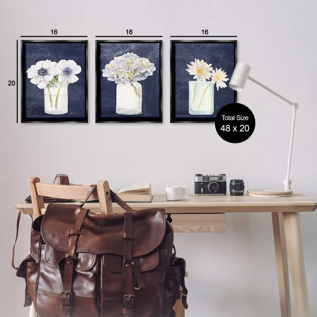 Stupell Navy Blue Flower Bouquets Framed Floater Canvas Wall Art Design By James Wiens (Set Of 3) - 17 X 21 - Black