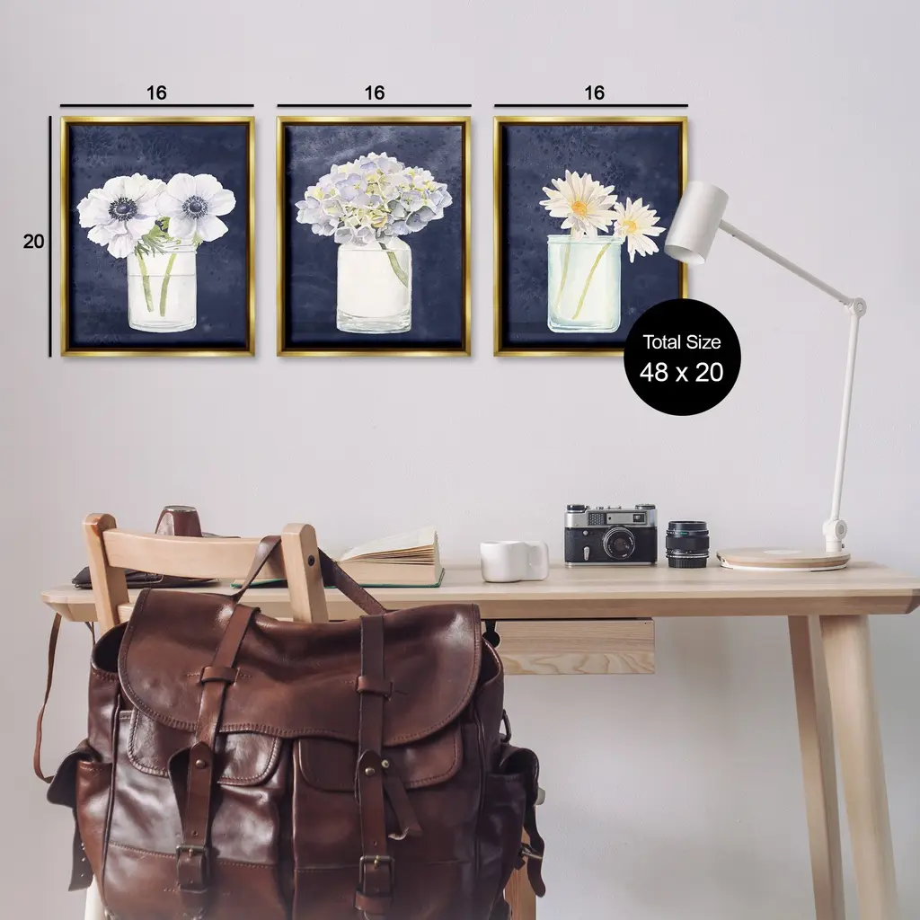 Stupell Navy Blue Flower Bouquets Framed Floater Canvas Wall Art Design By James Wiens (Set Of 3) - 17 X 21 - Gold