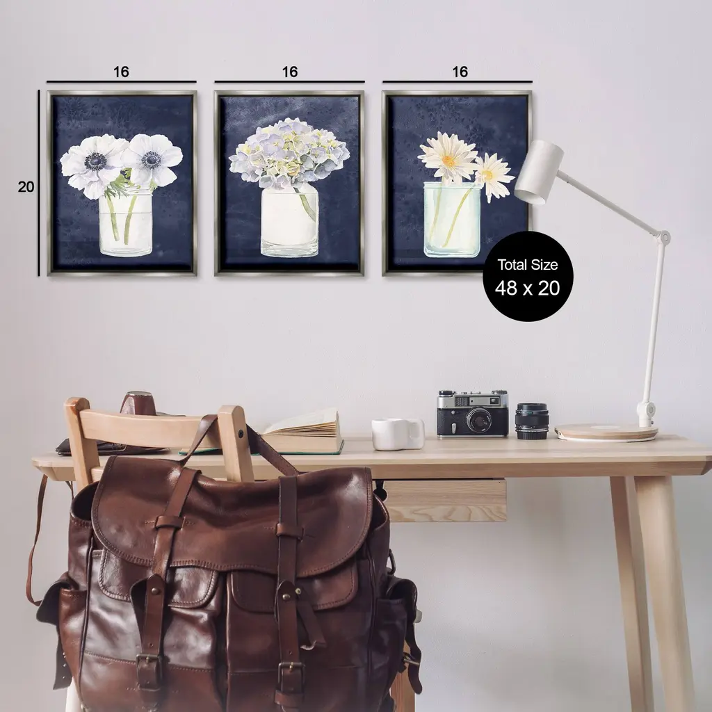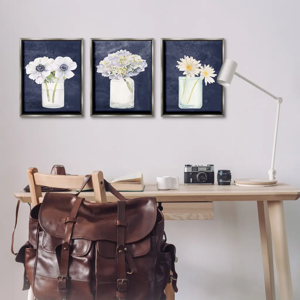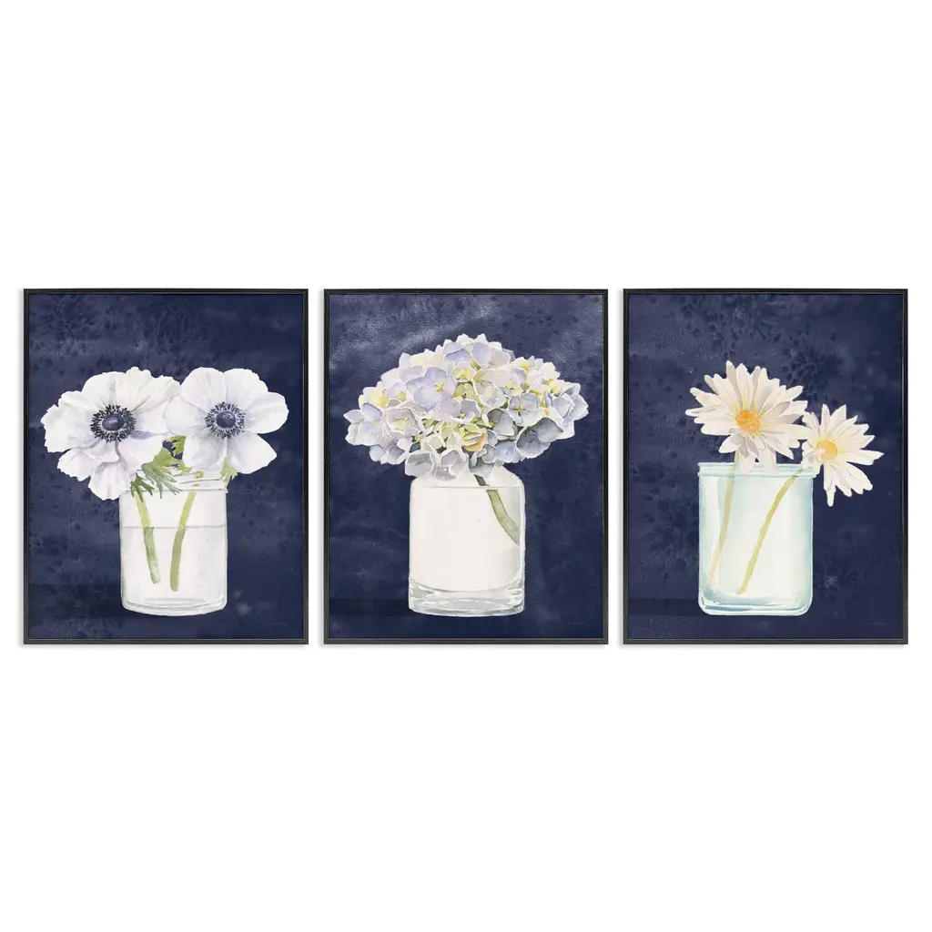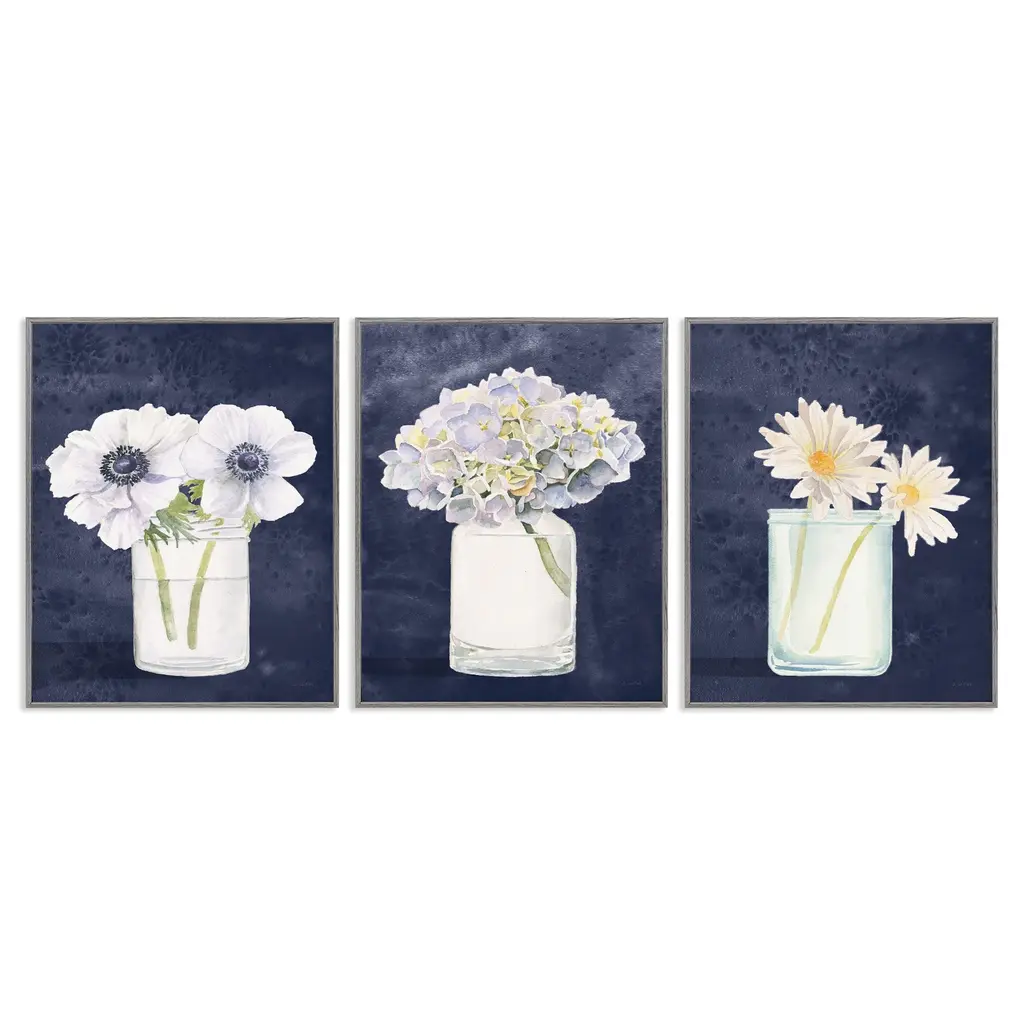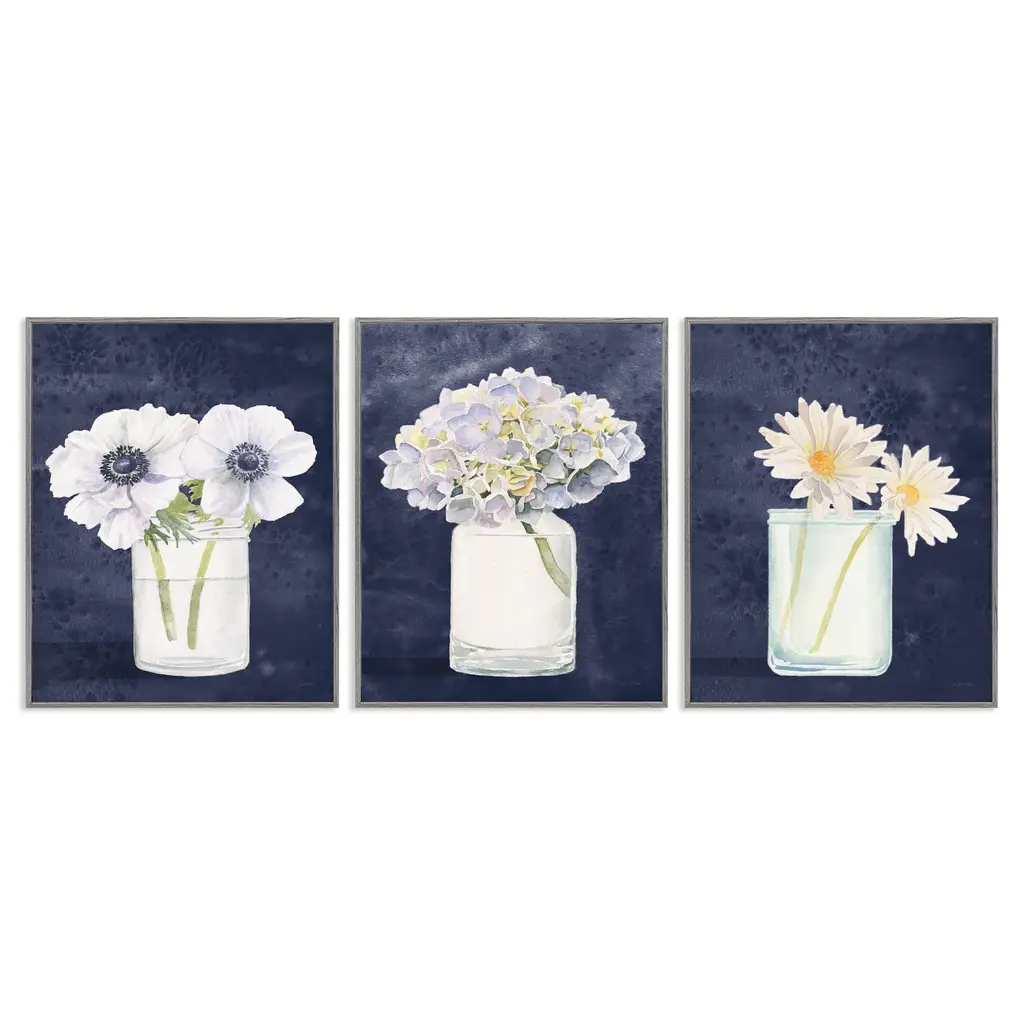 Stupell Navy Blue Flower Bouquets Framed Floater Canvas Wall Art Design By James Wiens (Set Of 3) - 17 X 21 - Grey