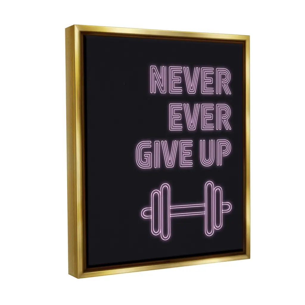 Elevate your home or office to the next level with Stupell Framed Floating Canvas Wall Art. Our premium hand-stretched canvas is mounted securely into a sturdy lightweight frame. The museum-style gap between the wrapped canvas and the box frame gives the illusion of floating artwork. Stupell Wall Art is made in the USA.Features: Dimensions: 17 x 1.7 x 21 Frame, 16 x 1.5 x 20 Canvas ArtFloating Frame Canvas Products are available in sizes 17"x21" and 25"x31". All Floating Frame Canvas Products have a 1.7" Depth.Wall Art is Ready to Hang with Hardware Free Hanging. No Installation required. For Easy Set Up Lean or Layer Artwork on Shelf or Against Wall. Artwork is Permently Fixed into the Frame.Our elevated 1.7" Thick Floating Frame is the perfect complement to our canvas style Wall Art. We use only the highest quality inks in house with industry leading printing solutions. Canvas is hand stretched over a durable wood foundation and then mounted securly into a Modern Box Frame. Made in the USA.Artwork Relates To: Exercise, Fitness, Workout, Weightlifting, Neon, Inspirational, Motivational, Never Ever Give UpDesign by Victoria Barnes