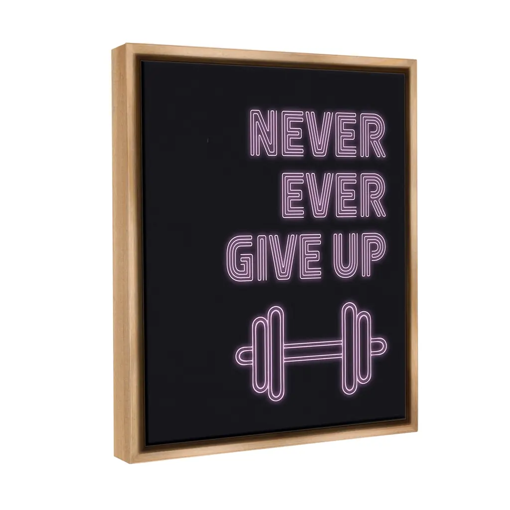 Elevate your home or office to the next level with Stupell Framed Floating Canvas Wall Art. Our premium hand-stretched canvas is mounted securely into a sturdy lightweight frame. The museum-style gap between the wrapped canvas and the box frame gives the illusion of floating artwork. Stupell Wall Art is made in the USA.Features: Dimensions: 17 x 1.7 x 21 Frame, 16 x 1.5 x 20 Canvas ArtFloating Frame Canvas Products are available in sizes 17"x21" and 25"x31". All Floating Frame Canvas Products have a 1.7" Depth.Wall Art is Ready to Hang with Hardware Free Hanging. No Installation required. For Easy Set Up Lean or Layer Artwork on Shelf or Against Wall. Artwork is Permently Fixed into the Frame.Our elevated 1.7" Thick Floating Frame is the perfect complement to our canvas style Wall Art. We use only the highest quality inks in house with industry leading printing solutions. Canvas is hand stretched over a durable wood foundation and then mounted securly into a Modern Box Frame. Made in the USA.Artwork Relates To: Exercise, Fitness, Workout, Weightlifting, Neon, Inspirational, Motivational, Never Ever Give UpDesign by Victoria Barnes