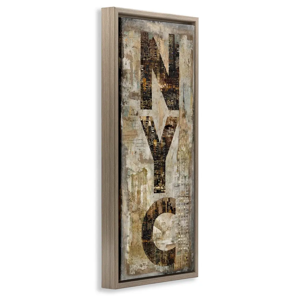 Elevate your home or office to the next level with Stupell Framed Floating Canvas Wall Art. Our premium hand-stretched canvas is mounted securely into a sturdy lightweight frame. The museum-style gap between the wrapped canvas and the box frame gives the illusion of floating artwork. Stupell Wall Art is made in the USA.Features: Dimensions: 11 x 1.7 x 25 Frame, 10 x 1.5 x 24 Canvas ArtFloating Frame Canvas Products are available in sizes 11"x25" and 14"x31". All Floating Frame Canvas Products have a 1.7" Depth.Wall Art is Ready to Hang with Hardware Free Hanging. No Installation required. For Easy Set Up Lean or Layer Artwork on Shelf or Against Wall. Artwork is Permently Fixed into the Frame.Our elevated 1.7" Thick Floating Frame is the perfect complement to our canvas style Wall Art. We use only the highest quality inks in house with industry leading printing solutions. Canvas is hand stretched over a durable wood foundation and then mounted securly into a Modern Box Frame. Made in the USA.Artwork Relates To: Rustic, Urban, Industrial, City, Letters, NYCDesign by Luke Wilson