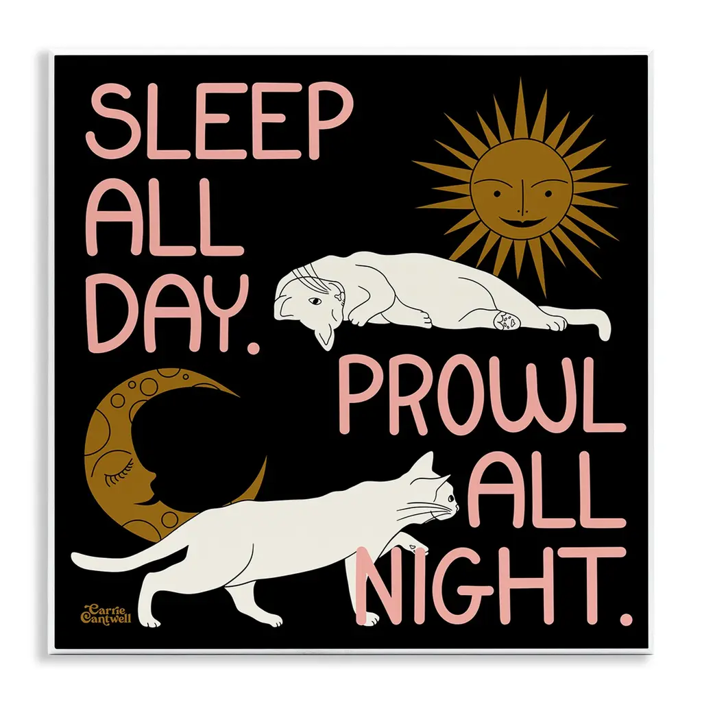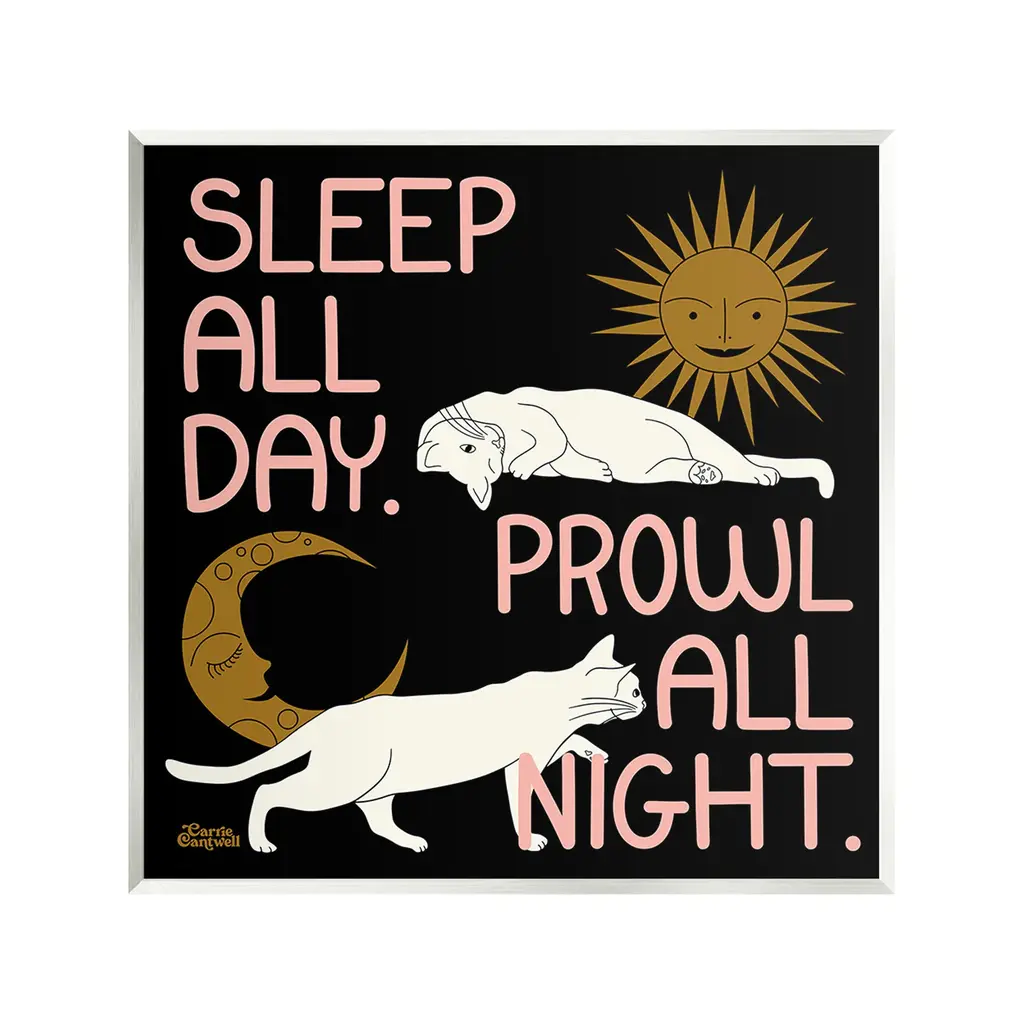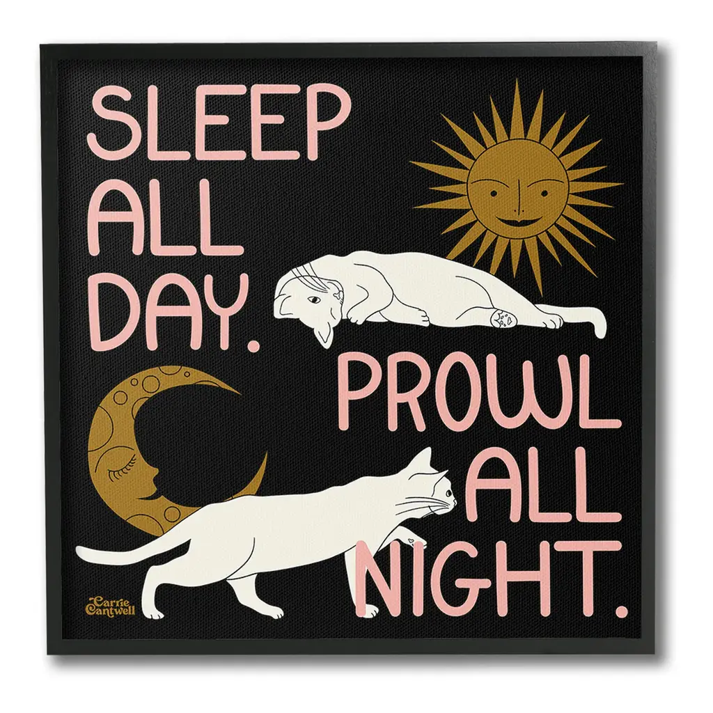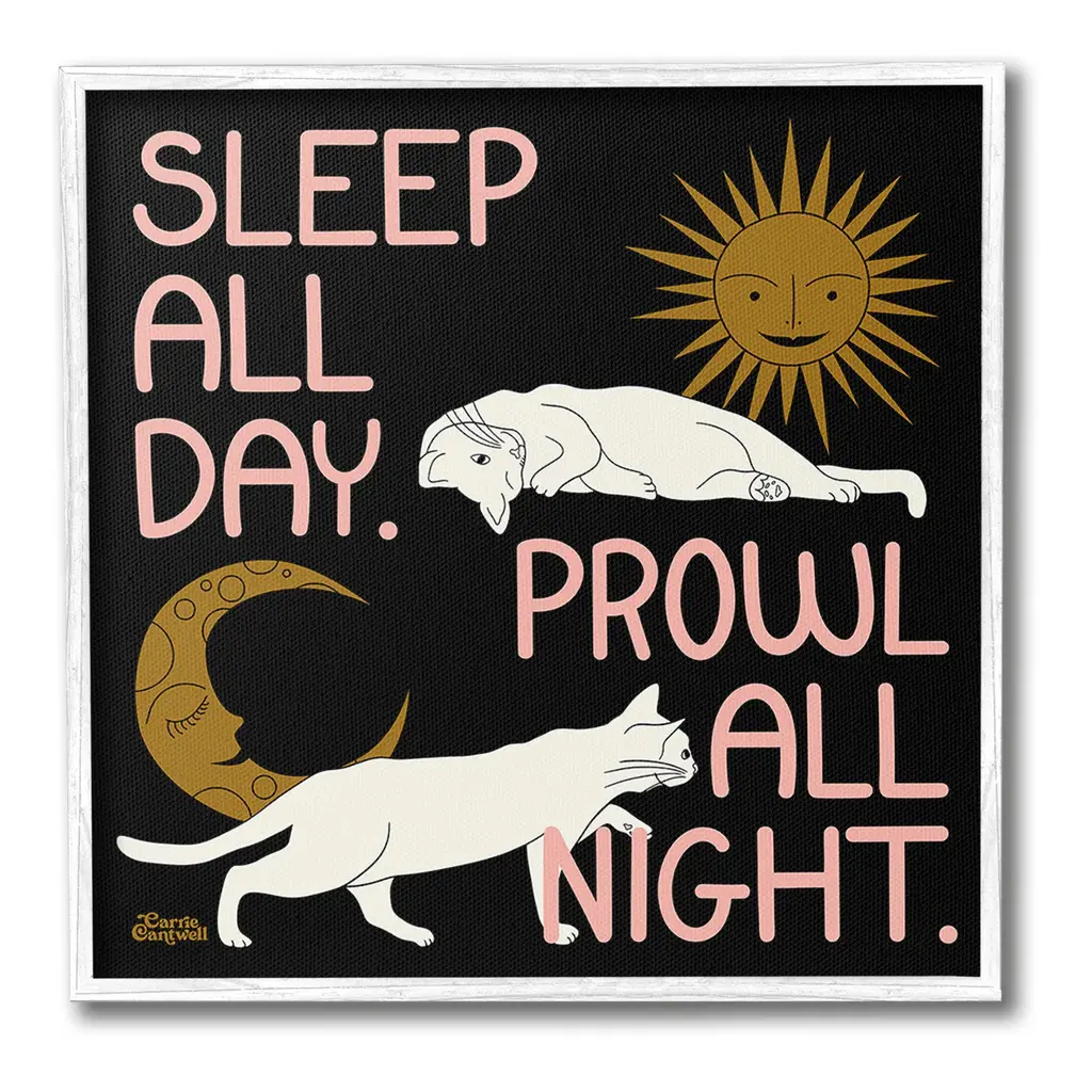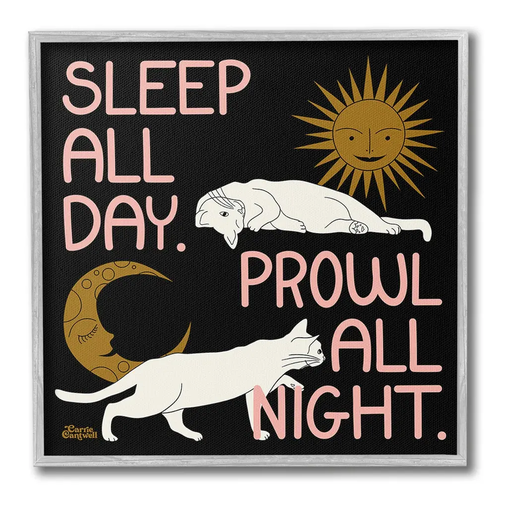 Elevate your home or office to the next level with Stupell Framed Floating Canvas Wall Art. Our premium hand-stretched canvas is mounted securely into a sturdy lightweight frame. The museum-style gap between the wrapped canvas and the box frame gives the illusion of floating artwork. Stupell Wall Art is made in the USA.Features: Dimensions: 18 x 1.7 x 18 Frame, 17 x 1.5 x 17 Canvas ArtFloating Frame Canvas Products are available in sizes 18"x18" and 25"x25". All Floating Frame Canvas Products have a 1.7" Depth.Wall Art is Ready to Hang with Hardware Free Hanging. No Installation required. For Easy Set Up Lean or Layer Artwork on Shelf or Against Wall. Artwork is Permently Fixed into the Frame.Our elevated 1.7" Thick Floating Frame is the perfect complement to our canvas style Wall Art. We use only the highest quality inks in house with industry leading printing solutions. Canvas is hand stretched over a durable wood foundation and then mounted securly into a Modern Box Frame. Made in the USA.Artwork Relates To: Animal, Mammal, Wildlife, Cat, Pet, Moon, Sun, Astral, Phrase, Sleep All Day, Prowl All NightDesign by Carrie Cantwell