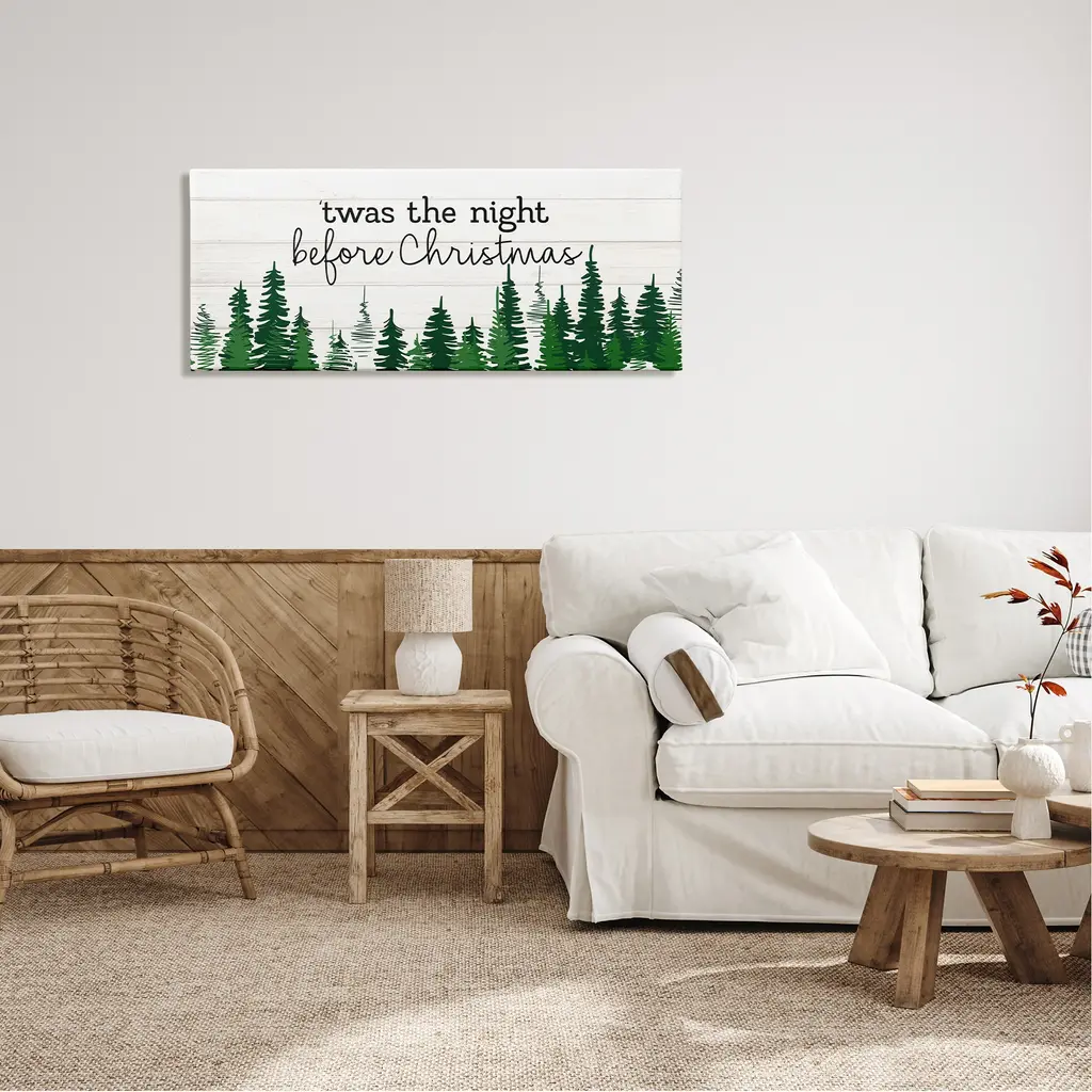 We create our stretched canvas to the highest standards. Using only the highest quality inks and canvas on Mimaki printers, we hand-cut and stretch each piece over a 1.5-inch thick wooden frame for hanging. As a result, the art comes ready to hang on the sturdy ledge with no installation required. Stupell Wall Art is made in the USA.Features: Dimensions: 24 x 1.5 x 10 InchesStretched Canvas Sizes Include Standard: 24 x 1.5 x 10 Large: 30 x 1.5 x 13 X-Large: 40 x 1.5 x 17 Oversized: 48 x 1.5 x 20Wall Art is Ready to Hang with Hardware Free Hanging. No installation required. For Easy Set Up Lean or Layer Artwork on Shelf or Against Wall.Our stretched canvas is created with the highest standards. We use only the highest quality inks and canvas on our in house Mimaki printers, and then hand cut and stretch each piece over a 1.5 inch thick wooden frame for hanging. Made In USA.Artwork Relates To: Plant, Tree, Pine, Green, Fir, Conifer, 'twas the night before Christmas Design by Kim Allen