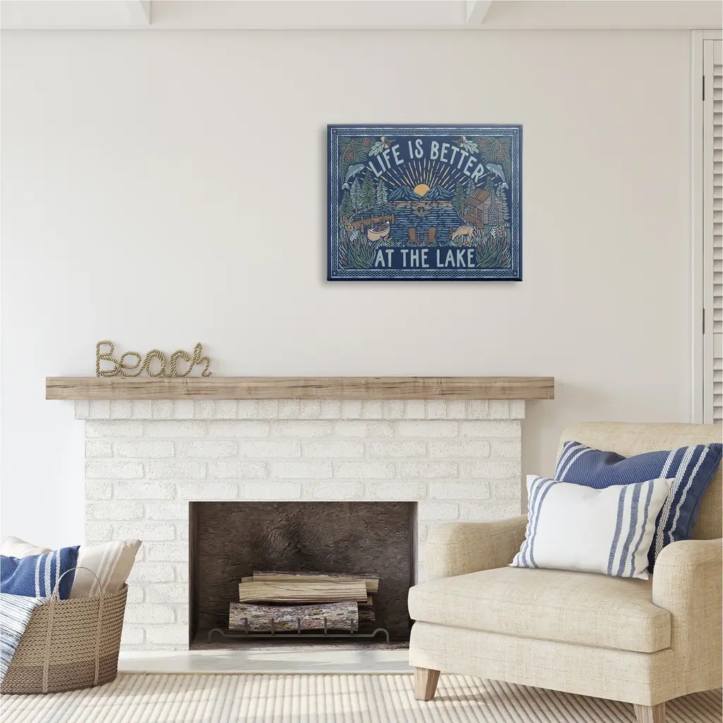 We create our stretched canvas to the highest standards. Using only the highest quality inks and canvas on Mimaki printers, we hand-cut and stretch each piece over a 1.5-inch thick wooden frame for hanging. As a result, the art comes ready to hang on the sturdy ledge with no installation required. Stupell Wall Art is made in the USA.Features: Dimensions: 20 x 1.5 x 16 InchesStretched Canvas Sizes Include Standard: 20 x 1.5 x 16 Large: 30 x 1.5 x 20 X-Large: 40 x 1.5 x 30 Oversized: 48 x 1.5 x 36Wall Art is Ready to Hang with Hardware Free Hanging. No installation required. For Easy Set Up Lean or Layer Artwork on Shelf or Against Wall.Our stretched canvas is created with the highest standards. We use only the highest quality inks and canvas on our in house Mimaki printers, and then hand cut and stretch each piece over a 1.5 inch thick wooden frame for hanging. Made In USA.Artwork Relates To: Lake, Mountain, Nature, Cabin, Duck, Botanical, Plants, Canoe, Life Is Better At The LakeDesign by Laura Marshall