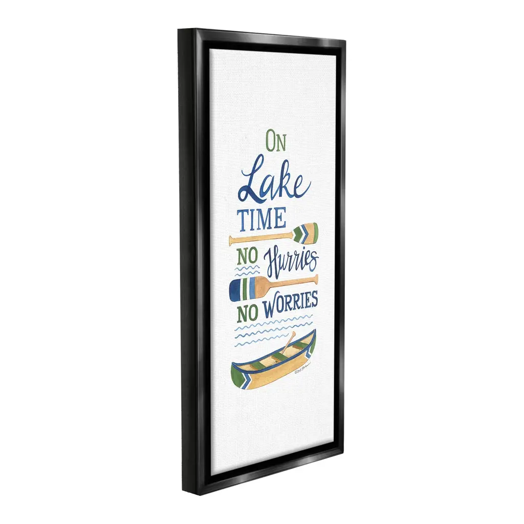 Elevate your home or office to the next level with Stupell Framed Floating Canvas Wall Art. Our premium hand-stretched canvas is mounted securely into a sturdy lightweight frame. The museum-style gap between the wrapped canvas and the box frame gives the illusion of floating artwork. Stupell Wall Art is made in the USA.Features: Dimensions: 11 x 1.7 x 25 Frame, 10 x 1.5 x 24 Canvas ArtFloating Frame Canvas Products are available in sizes 11"x25" and 14"x31". All Floating Frame Canvas Products have a 1.7" Depth.Wall Art is Ready to Hang with Hardware Free Hanging. No Installation required. For Easy Set Up Lean or Layer Artwork on Shelf or Against Wall. Artwork is Permently Fixed into the Frame.Our elevated 1.7" Thick Floating Frame is the perfect complement to our canvas style Wall Art. We use only the highest quality inks in house with industry leading printing solutions. Canvas is hand stretched over a durable wood foundation and then mounted securly into a Modern Box Frame. Made in the USA.Artwork Relates To: Oars, Boat, Rowboat, Transportation, Vehicle, Canoe, Paddle, Kayak, Lake House, Nautical, On Lake Time, No Hurries, No WorriesDesign by Deb Strain