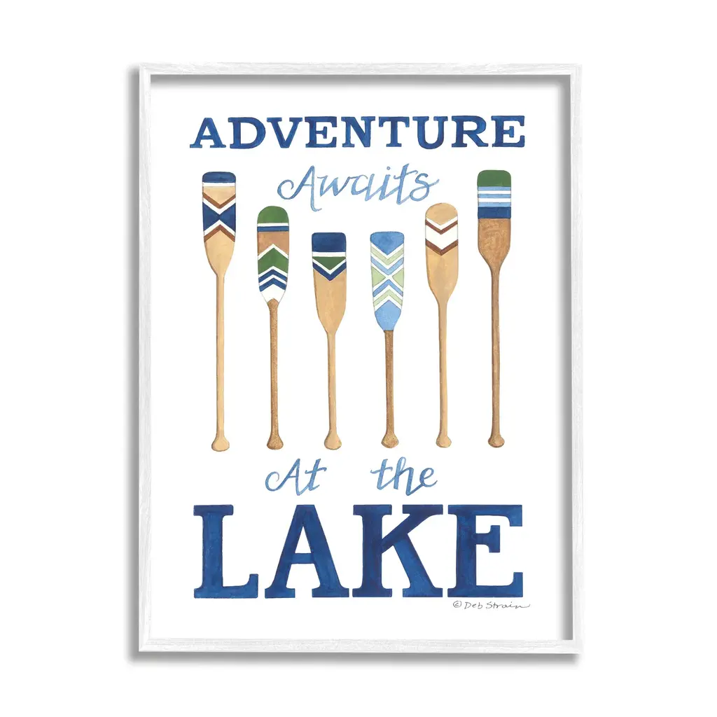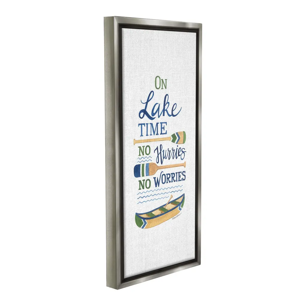 Elevate your home or office to the next level with Stupell Framed Floating Canvas Wall Art. Our premium hand-stretched canvas is mounted securely into a sturdy lightweight frame. The museum-style gap between the wrapped canvas and the box frame gives the illusion of floating artwork. Stupell Wall Art is made in the USA.Features: Dimensions: 11 x 1.7 x 25 Frame, 10 x 1.5 x 24 Canvas ArtFloating Frame Canvas Products are available in sizes 11"x25" and 14"x31". All Floating Frame Canvas Products have a 1.7" Depth.Wall Art is Ready to Hang with Hardware Free Hanging. No Installation required. For Easy Set Up Lean or Layer Artwork on Shelf or Against Wall. Artwork is Permently Fixed into the Frame.Our elevated 1.7" Thick Floating Frame is the perfect complement to our canvas style Wall Art. We use only the highest quality inks in house with industry leading printing solutions. Canvas is hand stretched over a durable wood foundation and then mounted securly into a Modern Box Frame. Made in the USA.Artwork Relates To: Oars, Boat, Rowboat, Transportation, Vehicle, Canoe, Paddle, Kayak, Lake House, Nautical, On Lake Time, No Hurries, No WorriesDesign by Deb Strain