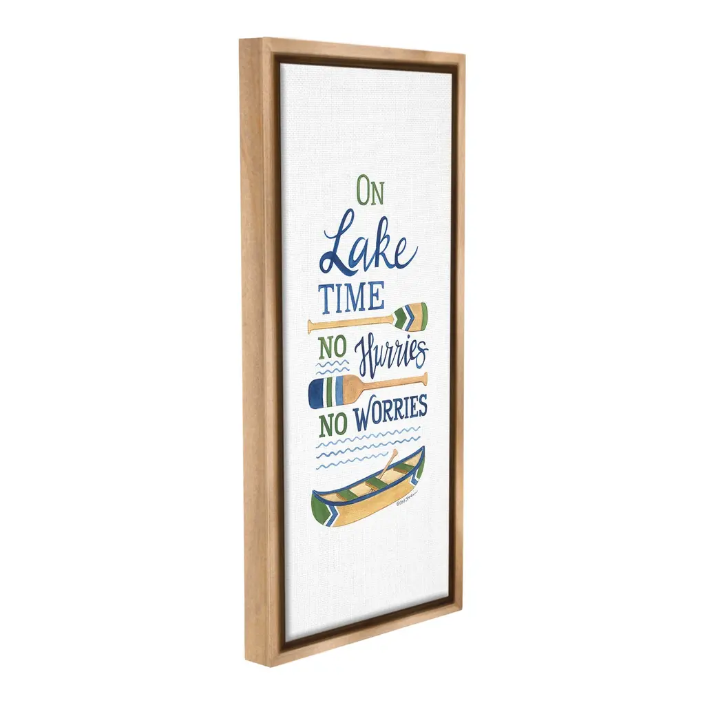Elevate your home or office to the next level with Stupell Framed Floating Canvas Wall Art. Our premium hand-stretched canvas is mounted securely into a sturdy lightweight frame. The museum-style gap between the wrapped canvas and the box frame gives the illusion of floating artwork. Stupell Wall Art is made in the USA.Features: Dimensions: 11 x 1.7 x 25 Frame, 10 x 1.5 x 24 Canvas ArtFloating Frame Canvas Products are available in sizes 11"x25" and 14"x31". All Floating Frame Canvas Products have a 1.7" Depth.Wall Art is Ready to Hang with Hardware Free Hanging. No Installation required. For Easy Set Up Lean or Layer Artwork on Shelf or Against Wall. Artwork is Permently Fixed into the Frame.Our elevated 1.7" Thick Floating Frame is the perfect complement to our canvas style Wall Art. We use only the highest quality inks in house with industry leading printing solutions. Canvas is hand stretched over a durable wood foundation and then mounted securly into a Modern Box Frame. Made in the USA.Artwork Relates To: Oars, Boat, Rowboat, Transportation, Vehicle, Canoe, Paddle, Kayak, Lake House, Nautical, On Lake Time, No Hurries, No WorriesDesign by Deb Strain