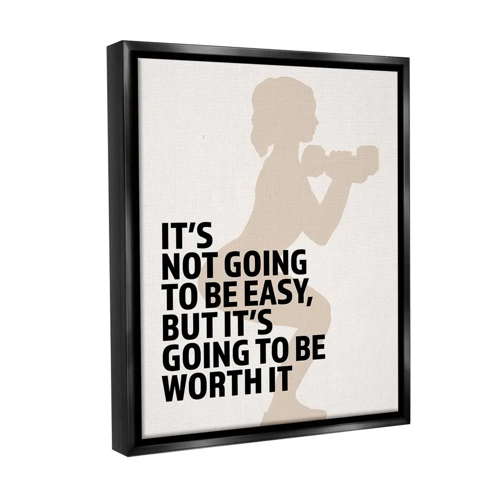 Elevate your home or office to the next level with Stupell Framed Floating Canvas Wall Art. Our premium hand-stretched canvas is mounted securely into a sturdy lightweight frame. The museum-style gap between the wrapped canvas and the box frame gives the illusion of floating artwork. Stupell Wall Art is made in the USA.Features: Dimensions: 17 x 1.7 x 21 Frame, 16 x 1.5 x 20 Canvas ArtFloating Frame Canvas Products are available in sizes 17"x21" and 25"x31". All Floating Frame Canvas Products have a 1.7" Depth.Wall Art is Ready to Hang with Hardware Free Hanging. No Installation required. For Easy Set Up Lean or Layer Artwork on Shelf or Against Wall. Artwork is Permently Fixed into the Frame.Our elevated 1.7" Thick Floating Frame is the perfect complement to our canvas style Wall Art. We use only the highest quality inks in house with industry leading printing solutions. Canvas is hand stretched over a durable wood foundation and then mounted securly into a Modern Box Frame. Made in the USA.Artwork Relates To: Exercise, Fitness, Workout, Weightlifting, Inspirational, Motivational, It's Not Going To Be Easy But It's Going To Be Worth ItDesign by Victoria Barnes