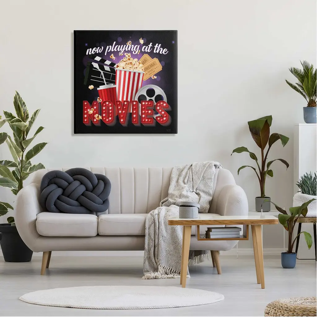 We create our stretched canvas to the highest standards. Using only the highest quality inks and canvas on Mimaki printers, we hand-cut and stretch each piece over a 1.5-inch thick wooden frame for hanging. As a result, the art comes ready to hang on the sturdy ledge with no installation required. Stupell Wall Art is made in the USA.Features: Dimensions: 17 x 1.5 x 17 InchesStretched Canvas Sizes Include Standard: 17 x 1.5 x 17 Large: 24 x 1.5 x 24 X-Large: 30 x 1.5 x 30 Oversized: 36 x 1.5 x 36Wall Art is Ready to Hang with Hardware Free Hanging. No installation required. For Easy Set Up Lean or Layer Artwork on Shelf or Against Wall.Our stretched canvas is created with the highest standards. We use only the highest quality inks and canvas on our in house Mimaki printers, and then hand cut and stretch each piece over a 1.5 inch thick wooden frame for hanging. Made In USA.Artwork Relates To: Phrase, Sign, Movies, Film, Theater, Popcorn, Now Playing at the MoviesDesign by Lux + Me Designs