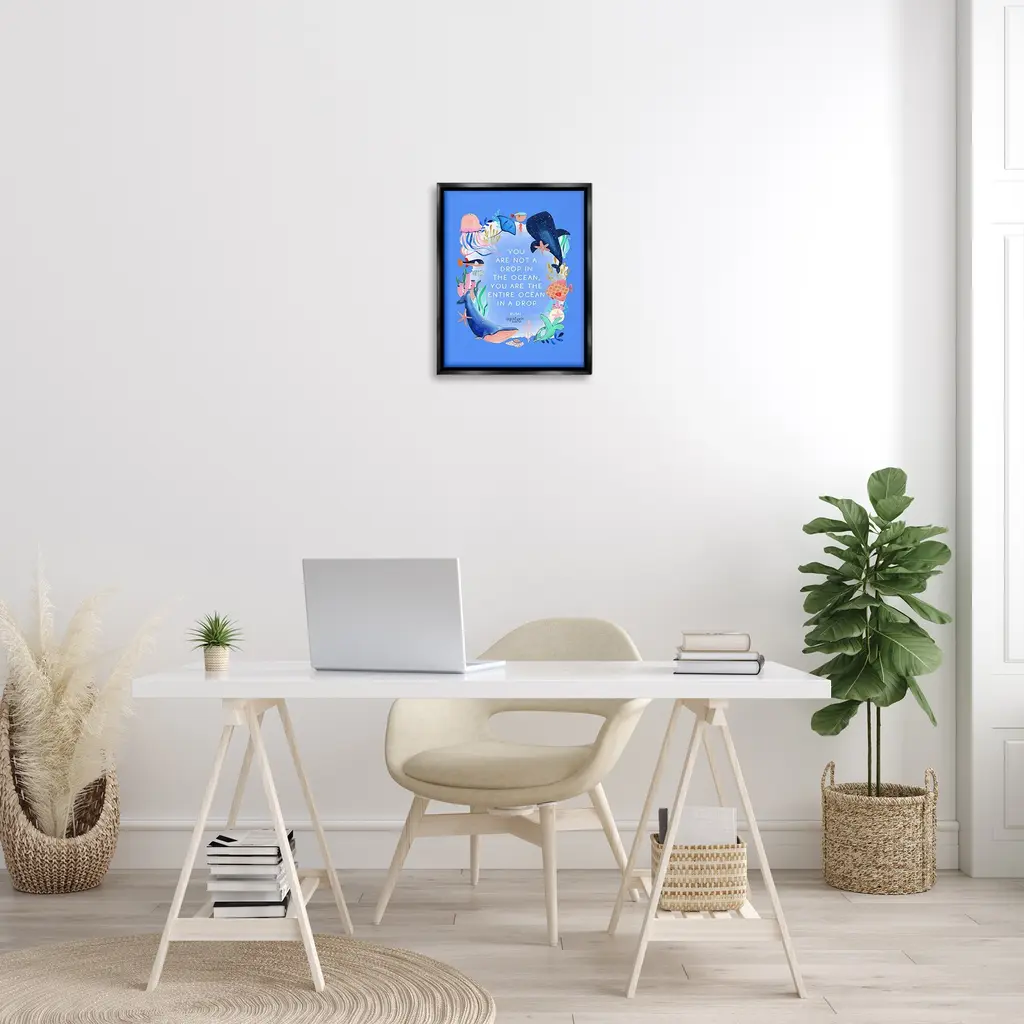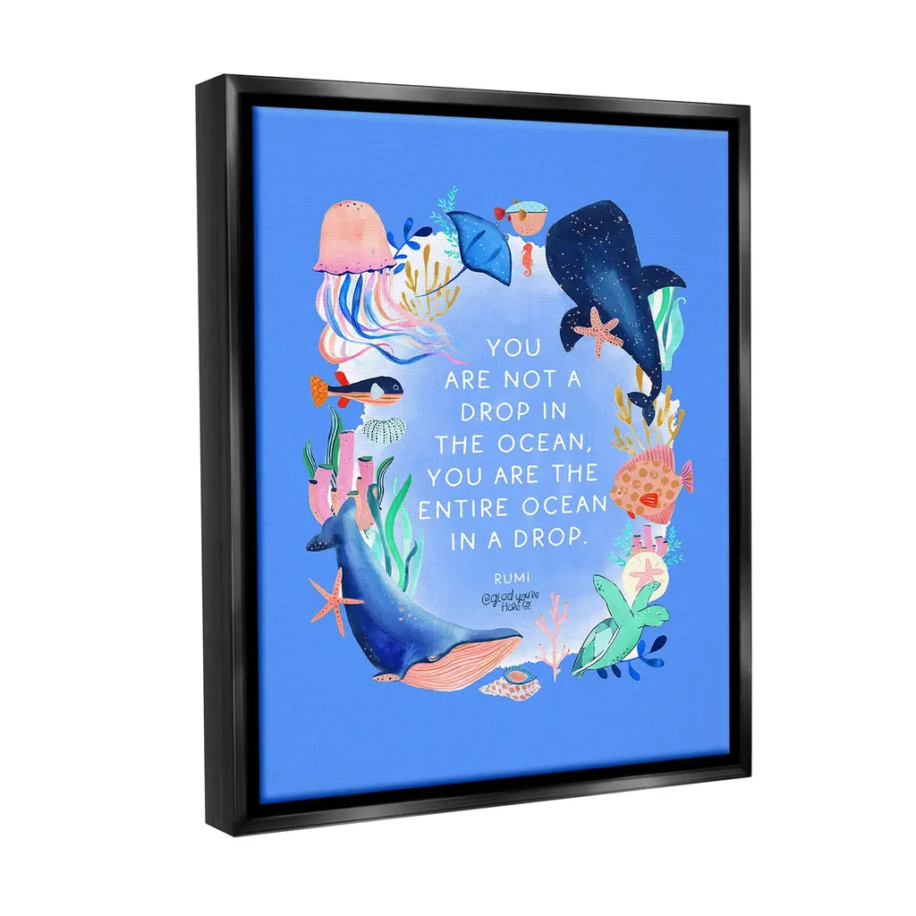 Elevate your home or office to the next level with Stupell Framed Floating Canvas Wall Art. Our premium hand-stretched canvas is mounted securely into a sturdy lightweight frame. The museum-style gap between the wrapped canvas and the box frame gives the illusion of floating artwork. Stupell Wall Art is made in the USA.Features: Dimensions: 17 x 1.7 x 21 Frame, 16 x 1.5 x 20 Canvas ArtFloating Frame Canvas Products are available in sizes 17"x21" and 25"x31". All Floating Frame Canvas Products have a 1.7" Depth.Wall Art is Ready to Hang with Hardware Free Hanging. No Installation required. For Easy Set Up Lean or Layer Artwork on Shelf or Against Wall. Artwork is Permently Fixed into the Frame.Our elevated 1.7" Thick Floating Frame is the perfect complement to our canvas style Wall Art. We use only the highest quality inks in house with industry leading printing solutions. Canvas is hand stretched over a durable wood foundation and then mounted securly into a Modern Box Frame. Made in the USA.Artwork Relates To: Animal, Fish, Sea Life, Shark, Whale, Dolphin, Nautical, Beach, Maritime, Fish, You are Not a Drop in the Ocean You are the Entire Ocean in a DropDesign by Glad You're Here Co.
