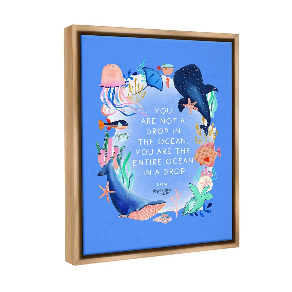 Elevate your home or office to the next level with Stupell Framed Floating Canvas Wall Art. Our premium hand-stretched canvas is mounted securely into a sturdy lightweight frame. The museum-style gap between the wrapped canvas and the box frame gives the illusion of floating artwork. Stupell Wall Art is made in the USA.Features: Dimensions: 17 x 1.7 x 21 Frame, 16 x 1.5 x 20 Canvas ArtFloating Frame Canvas Products are available in sizes 17"x21" and 25"x31". All Floating Frame Canvas Products have a 1.7" Depth.Wall Art is Ready to Hang with Hardware Free Hanging. No Installation required. For Easy Set Up Lean or Layer Artwork on Shelf or Against Wall. Artwork is Permently Fixed into the Frame.Our elevated 1.7" Thick Floating Frame is the perfect complement to our canvas style Wall Art. We use only the highest quality inks in house with industry leading printing solutions. Canvas is hand stretched over a durable wood foundation and then mounted securly into a Modern Box Frame. Made in the USA.Artwork Relates To: Animal, Fish, Sea Life, Shark, Whale, Dolphin, Nautical, Beach, Maritime, Fish, You are Not a Drop in the Ocean You are the Entire Ocean in a DropDesign by Glad You're Here Co.