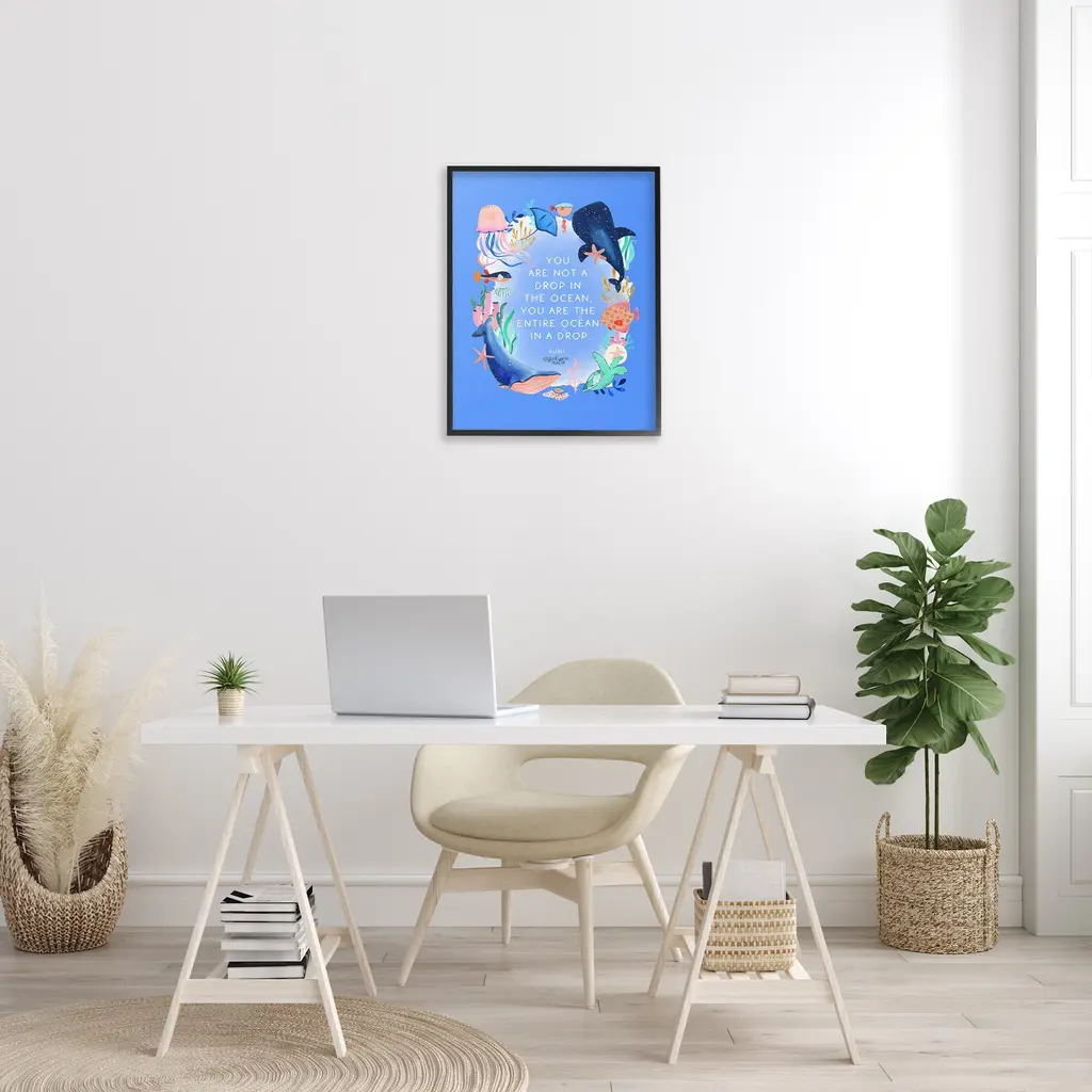 Add dimension to any room with our textured Framed Giclee Artwork. Our framed artwork is securely mounted into a 1.5-inch thick wood grain frame and ready to hang. Frames are available in three alluring styles: black, gray farmhouse and white. In addition, you should check out our oversized options if you want a statement piece. Stupell Wall Art is made in the USA.Features: Dimensions: 11 x 1.5 x 14 FramedFramed Giclee Products are available in the sizes 11"x14", 16"x20" or 24"x30". All Framed Giclee Products have a 1.5" Depth. Wall Art is Ready to Hang with Hardware Free Hanging. No installation required. For Easy Set Up Lean or Layer Artwork on Shelf or Against Wall.Our giclée prints are carefully mounted on a durable MDF backing, and then perfectly finished in a 1.5 inch thick woodgrain frame. Mounted frame colors include black, gray farmhouse and white. Made In USA.Artwork Relates To: Animal, Fish, Sea Life, Shark, Whale, Dolphin, Nautical, Beach, Maritime, Fish, You are Not a Drop in the Ocean You are the Entire Ocean in a DropDesign by Glad You're Here Co.