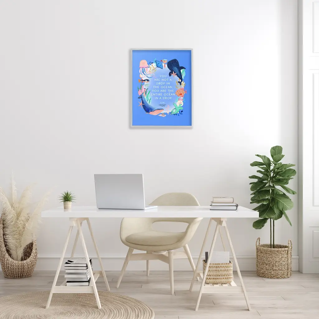 Add dimension to any room with our textured Framed Giclee Artwork. Our framed artwork is securely mounted into a 1.5-inch thick wood grain frame and ready to hang. Frames are available in three alluring styles: black, gray farmhouse and white. In addition, you should check out our oversized options if you want a statement piece. Stupell Wall Art is made in the USA.Features: Dimensions: 11 x 1.5 x 14 FramedFramed Giclee Products are available in the sizes 11"x14", 16"x20" or 24"x30". All Framed Giclee Products have a 1.5" Depth. Wall Art is Ready to Hang with Hardware Free Hanging. No installation required. For Easy Set Up Lean or Layer Artwork on Shelf or Against Wall.Our giclée prints are carefully mounted on a durable MDF backing, and then perfectly finished in a 1.5 inch thick woodgrain frame. Mounted frame colors include black, gray farmhouse and white. Made In USA.Artwork Relates To: Animal, Fish, Sea Life, Shark, Whale, Dolphin, Nautical, Beach, Maritime, Fish, You are Not a Drop in the Ocean You are the Entire Ocean in a DropDesign by Glad You're Here Co.