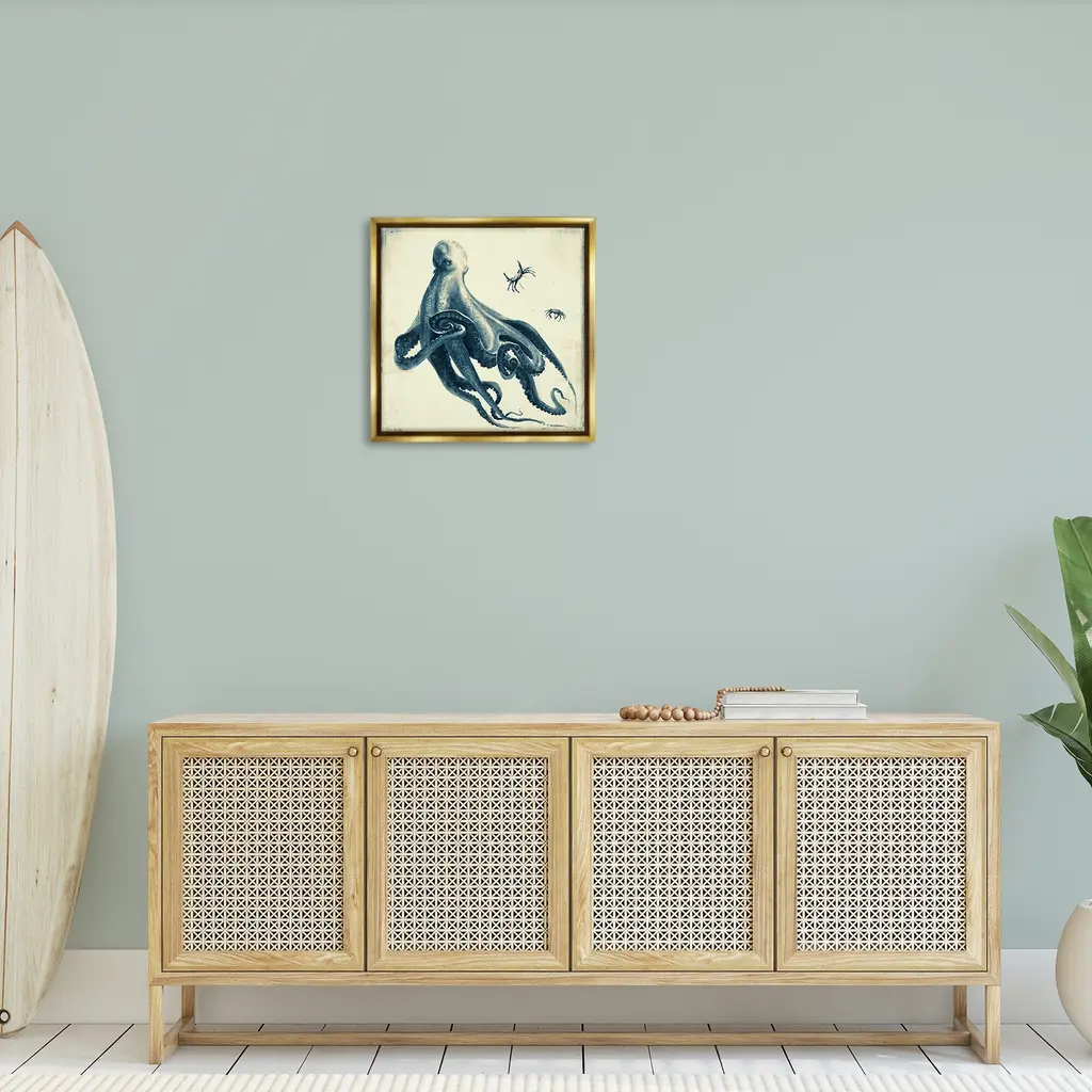 Elevate your home or office to the next level with Stupell Framed Floating Canvas Wall Art. Our premium hand-stretched canvas is mounted securely into a sturdy lightweight frame. The museum-style gap between the wrapped canvas and the box frame gives the illusion of floating artwork. Stupell Wall Art is made in the USA.Features: Dimensions: 18 x 1.7 x 18 Frame, 17 x 1.5 x 17 Canvas ArtFloating Frame Canvas Products are available in sizes 18"x18" and 25"x25". All Floating Frame Canvas Products have a 1.7" Depth.Wall Art is Ready to Hang with Hardware Free Hanging. No Installation required. For Easy Set Up Lean or Layer Artwork on Shelf or Against Wall. Artwork is Permently Fixed into the Frame.Our elevated 1.7" Thick Floating Frame is the perfect complement to our canvas style Wall Art. We use only the highest quality inks in house with industry leading printing solutions. Canvas is hand stretched over a durable wood foundation and then mounted securly into a Modern Box Frame. Made in the USA.Artwork Relates To: Animal, Sea Life, Invertebrate, Octopus, Marine, Ocean, Nautical, BeachDesign by Vlad Mel
