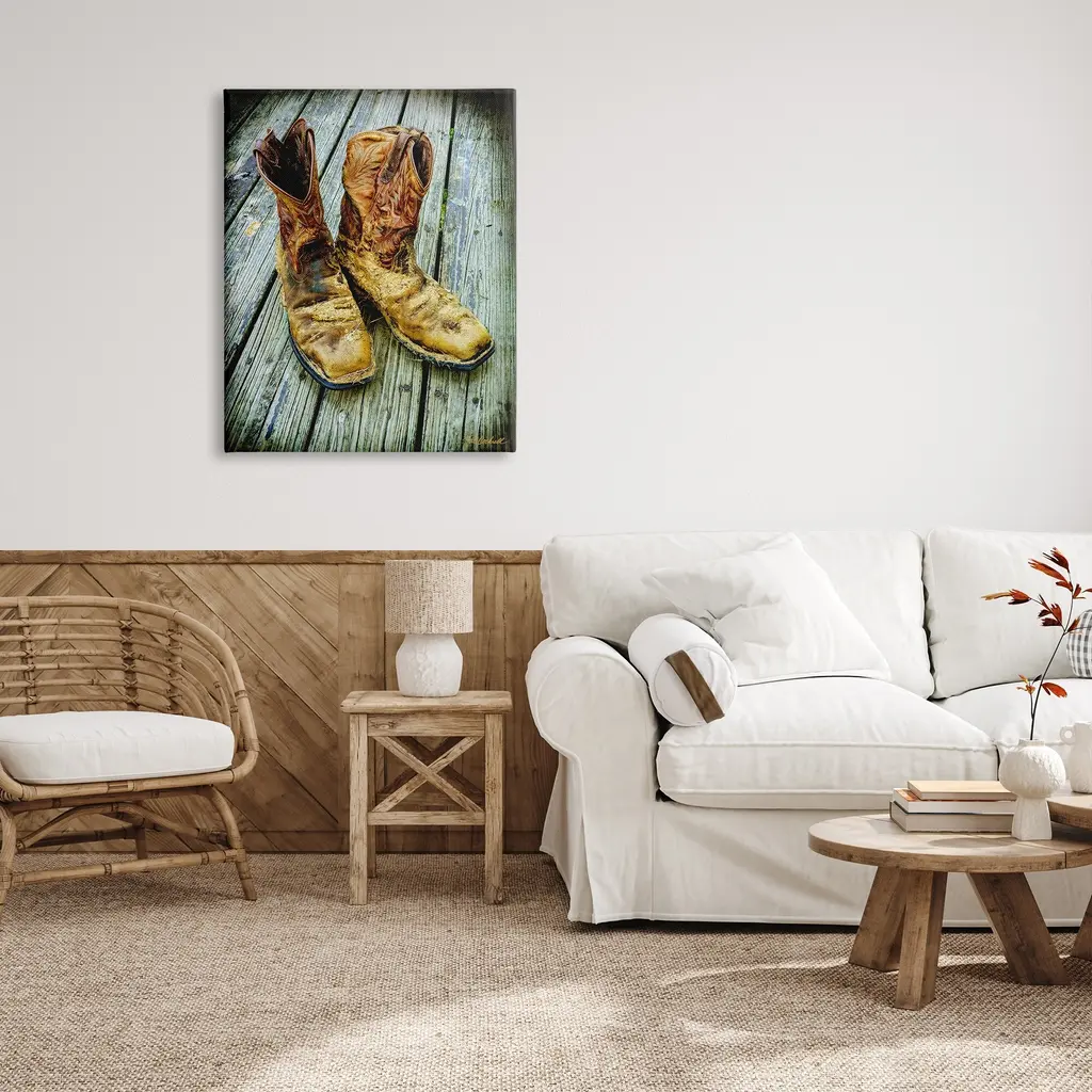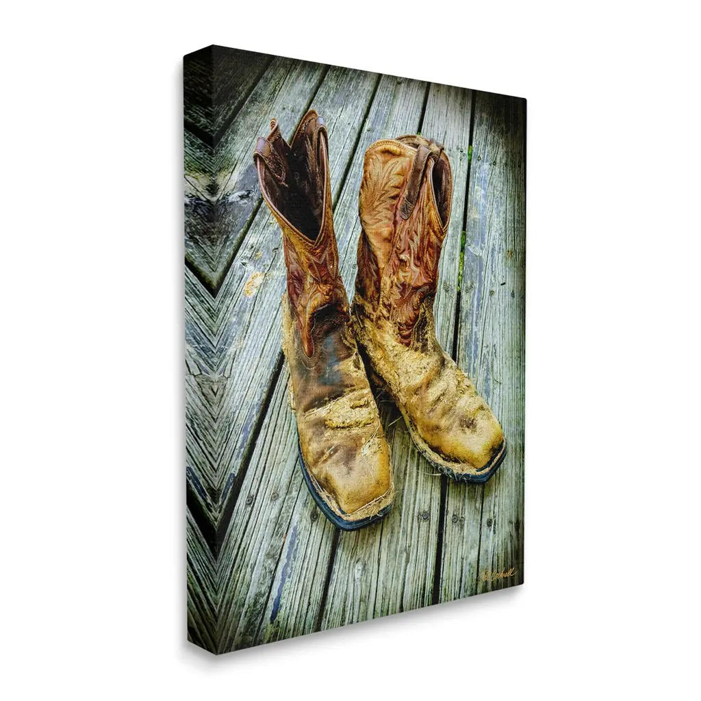 We create our stretched canvas to the highest standards. Using only the highest quality inks and canvas on Mimaki printers, we hand-cut and stretch each piece over a 1.5-inch thick wooden frame for hanging. As a result, the art comes ready to hang on the sturdy ledge with no installation required. Stupell Wall Art is made in the USA.Features: Dimensions: 16 x 1.5 x 20 InchesStretched Canvas Sizes Include Standard: 16 x 1.5 x 20 Large: 20 x 1.5 x 30 X-Large: 30 x 1.5 x 40 Oversized: 36 x 1.5 x 48Wall Art is Ready to Hang with Hardware Free Hanging. No installation required. For Easy Set Up Lean or Layer Artwork on Shelf or Against Wall.Our stretched canvas is created with the highest standards. We use only the highest quality inks and canvas on our in house Mimaki printers, and then hand cut and stretch each piece over a 1.5 inch thick wooden frame for hanging. Made In USA.Artwork Relates To: Boot, Clothing, Footwear, Cowboy BootDesign by Pat Cockrell