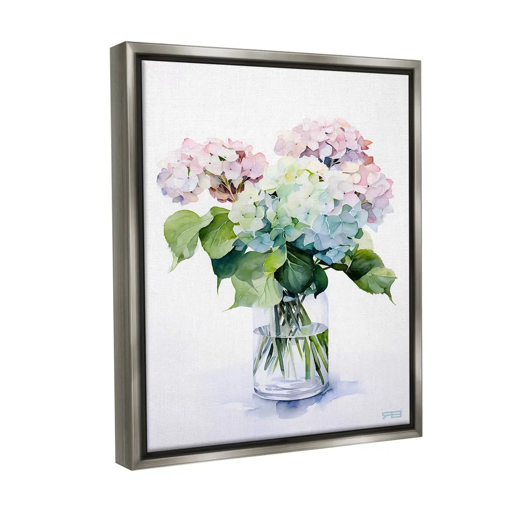 Elevate your home or office to the next level with Stupell Framed Floating Canvas Wall Art. Our premium hand-stretched canvas is mounted securely into a sturdy lightweight frame. The museum-style gap between the wrapped canvas and the box frame gives the illusion of floating artwork. Stupell Wall Art is made in the USA.Features: Dimensions: 17 x 1.7 x 21 Frame, 16 x 1.5 x 20 Canvas ArtFloating Frame Canvas Products are available in sizes 17"x21" and 25"x31". All Floating Frame Canvas Products have a 1.7" Depth.Wall Art is Ready to Hang with Hardware Free Hanging. No Installation required. For Easy Set Up Lean or Layer Artwork on Shelf or Against Wall. Artwork is Permently Fixed into the Frame.Our elevated 1.7" Thick Floating Frame is the perfect complement to our canvas style Wall Art. We use only the highest quality inks in house with industry leading printing solutions. Canvas is hand stretched over a durable wood foundation and then mounted securly into a Modern Box Frame. Made in the USA.Artwork Relates To: Flower, Plant, Bouquet, Vase, Floral, Minimal, Cottage, Country, HydrangeaDesign by RB