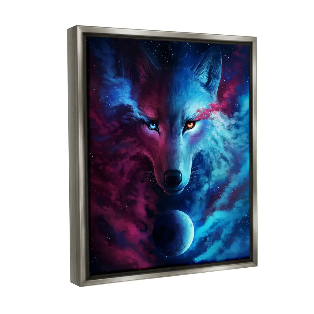 Elevate your home or office to the next level with Stupell Framed Floating Canvas Wall Art. Our premium hand-stretched canvas is mounted securely into a sturdy lightweight frame. The museum-style gap between the wrapped canvas and the box frame gives the illusion of floating artwork. Stupell Wall Art is made in the USA.Features: Dimensions: 17 x 1.7 x 21 Frame, 16 x 1.5 x 20 Canvas ArtFloating Frame Canvas Products are available in sizes 17"x21" and 25"x31". All Floating Frame Canvas Products have a 1.7" Depth.Wall Art is Ready to Hang with Hardware Free Hanging. No Installation required. For Easy Set Up Lean or Layer Artwork on Shelf or Against Wall. Artwork is Permently Fixed into the Frame.Our elevated 1.7" Thick Floating Frame is the perfect complement to our canvas style Wall Art. We use only the highest quality inks in house with industry leading printing solutions. Canvas is hand stretched over a durable wood foundation and then mounted securly into a Modern Box Frame. Made in the USA.Artwork Relates To: Nature, Night, Animal, Mammal, Wolf, Canine, Dog, Astronomy, Moon, Astral, Celestial, Feather, Pattern, Geometric, Lunar, CloudsDesign by Jonas Jodicke