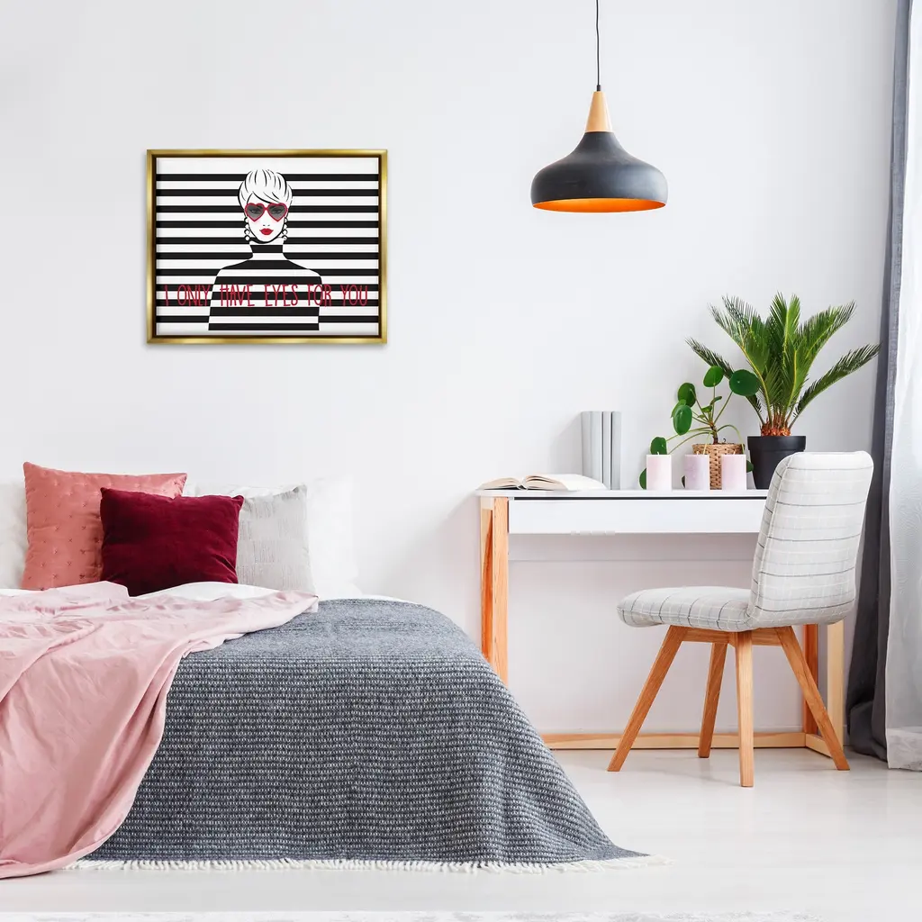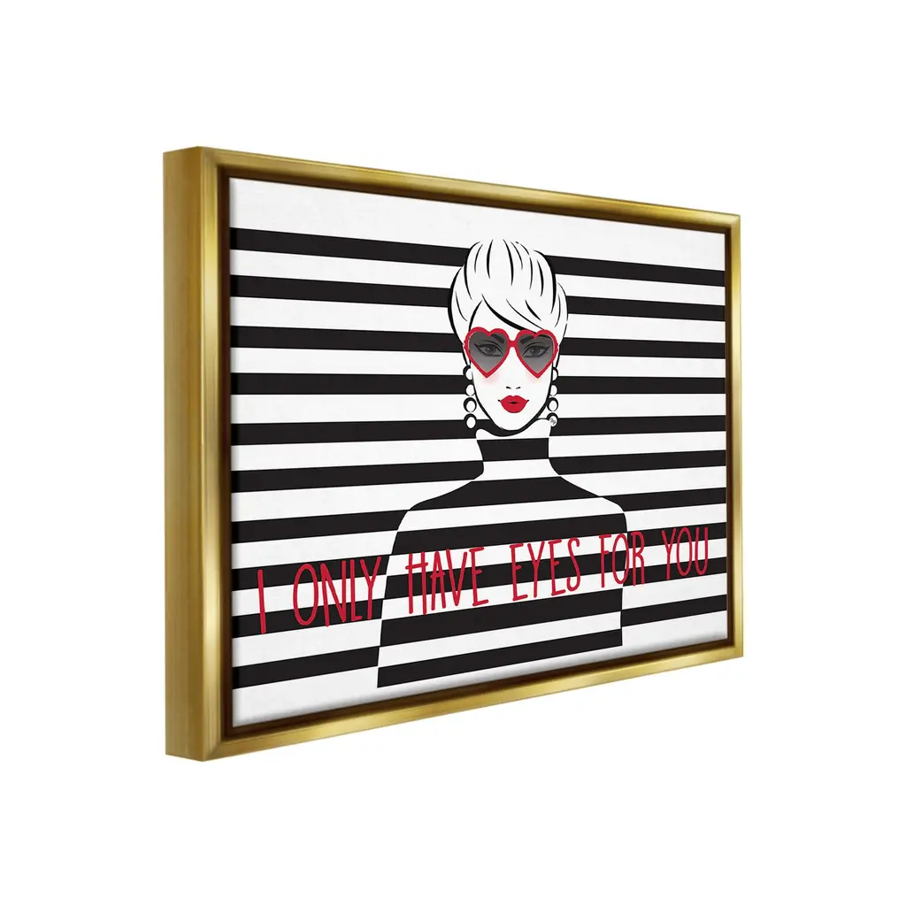 Elevate your home or office to the next level with Stupell Framed Floating Canvas Wall Art. Our premium hand-stretched canvas is mounted securely into a sturdy lightweight frame. The museum-style gap between the wrapped canvas and the box frame gives the illusion of floating artwork. Stupell Wall Art is made in the USA.Features: Dimensions: 21 x 1.7 x 17 Frame, 20 x 1.5 x 16 Canvas ArtFloating Frame Canvas Products are available in sizes 21"x17" and 31"x25". All Floating Frame Canvas Products have a 1.7" Depth.Wall Art is Ready to Hang with Hardware Free Hanging. No Installation required. For Easy Set Up Lean or Layer Artwork on Shelf or Against Wall. Artwork is Permently Fixed into the Frame.Our elevated 1.7" Thick Floating Frame is the perfect complement to our canvas style Wall Art. We use only the highest quality inks in house with industry leading printing solutions. Canvas is hand stretched over a durable wood foundation and then mounted securly into a Modern Box Frame. Made in the USA.Artwork Relates To: Female, Person, Woman, Fashion, Glam, Minimal, Pattern, Stripes, Romance, I Only Have Eyes For YouDesign by Martina Pavlova