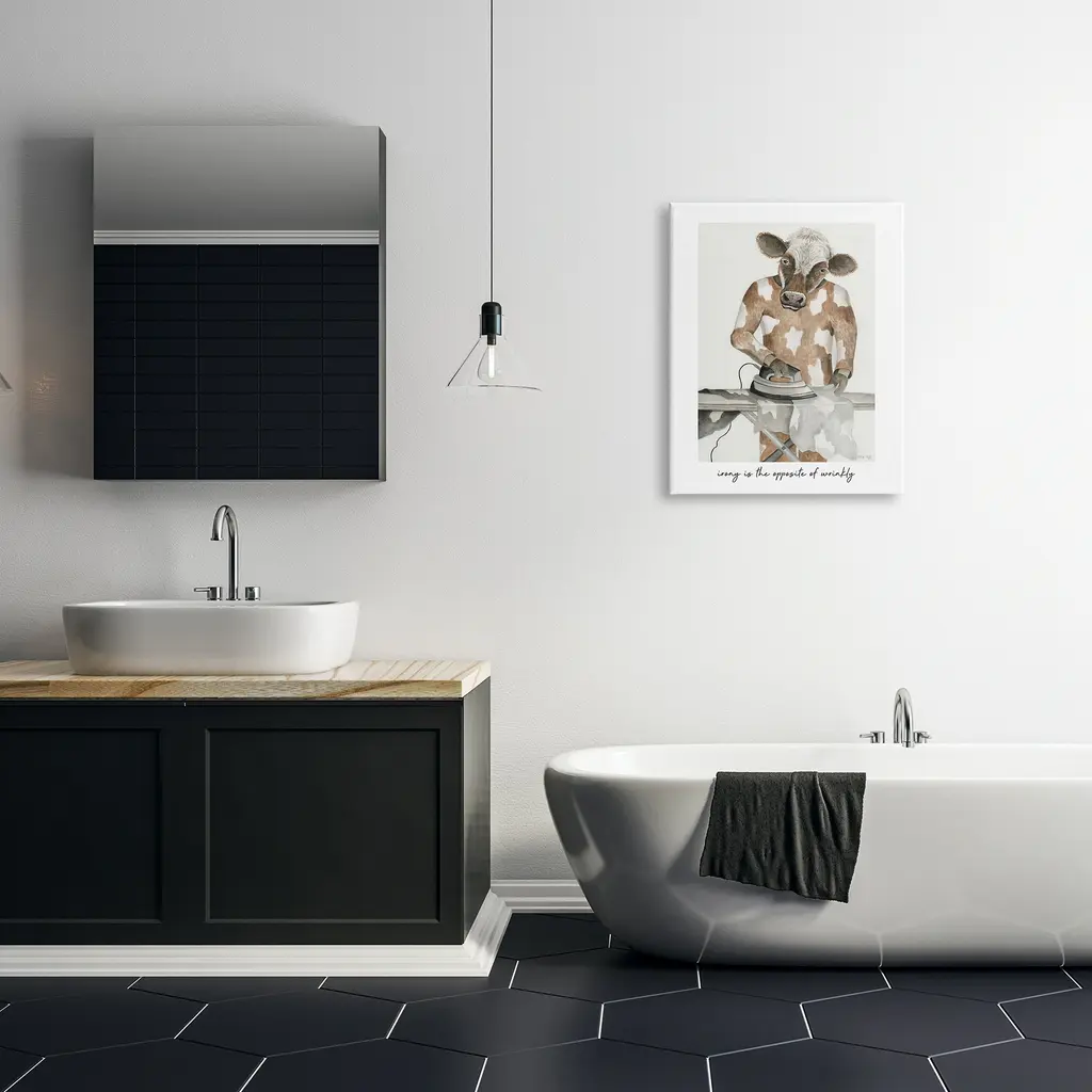 We create our stretched canvas to the highest standards. Using only the highest quality inks and canvas on Mimaki printers, we hand-cut and stretch each piece over a 1.5-inch thick wooden frame for hanging. As a result, the art comes ready to hang on the sturdy ledge with no installation required. Stupell Wall Art is made in the USA.Features: Dimensions: 16 x 1.5 x 20 InchesStretched Canvas Sizes Include Standard: 16 x 1.5 x 20 Large: 20 x 1.5 x 30 X-Large: 30 x 1.5 x 40 Oversized: 36 x 1.5 x 48Wall Art is Ready to Hang with Hardware Free Hanging. No installation required. For Easy Set Up Lean or Layer Artwork on Shelf or Against Wall.Our stretched canvas is created with the highest standards. We use only the highest quality inks and canvas on our in house Mimaki printers, and then hand cut and stretch each piece over a 1.5 inch thick wooden frame for hanging. Made In USA.Artwork Relates To: Clothing, Animal, Cow, Cattle, Laundry, Irony is the Opposite of WrinklyDesign by Cindy Jacobs
