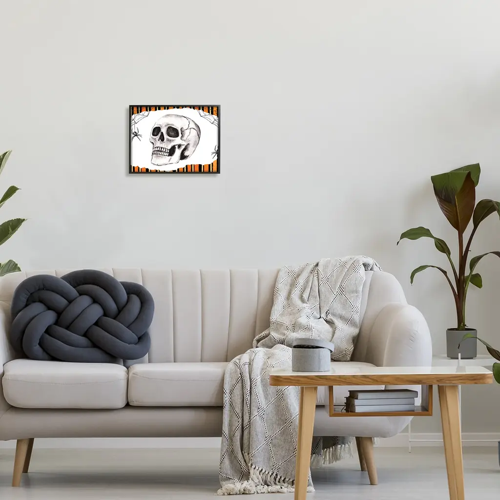 Add dimension to any room with our textured Framed Giclee Artwork. Our framed artwork is securely mounted into a 1.5-inch thick wood grain frame and ready to hang. Frames are available in three alluring styles: black, gray farmhouse and white. In addition, you should check out our oversized options if you want a statement piece. Stupell Wall Art is made in the USA.Features: Dimensions: 14 x 1.5 x 11 FramedFramed Giclee Sizes Include Standard: 14 x 1.5 x 11 Large: 20 x 1.5 x 16 Oversized: 30 x 1.5 x 24Wall Art is Ready to Hang - No Installation or Hardware Needed. For Easy Set Up Lean or Layer Artwork on Shelf or Against Wall.Our giclée prints are carefully mounted on a durable MDF backing, and then perfectly finished in a 1.5 inch thick woodgrain frame. Mounted frame colors include black, gray farmhouse and white. Made In USA.Artwork Relates To: Animal, Invertebrate, Spider, Skull, Skeleton, Halloween, Spider Web, Stripes, PatternDesign by ND Art