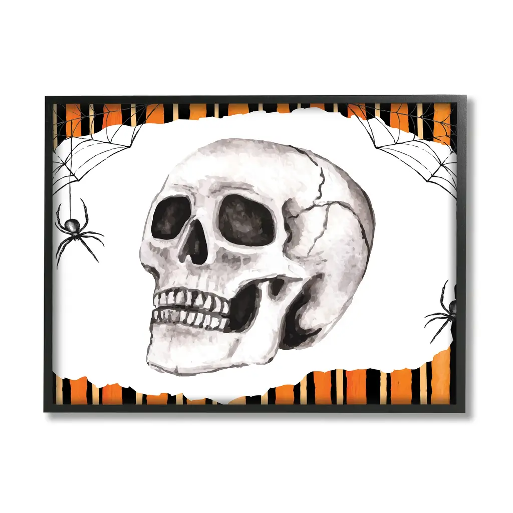 Add dimension to any room with our textured Framed Giclee Artwork. Our framed artwork is securely mounted into a 1.5-inch thick wood grain frame and ready to hang. Frames are available in three alluring styles: black, gray farmhouse and white. In addition, you should check out our oversized options if you want a statement piece. Stupell Wall Art is made in the USA.Features: Dimensions: 14 x 1.5 x 11 FramedFramed Giclee Sizes Include Standard: 14 x 1.5 x 11 Large: 20 x 1.5 x 16 Oversized: 30 x 1.5 x 24Wall Art is Ready to Hang - No Installation or Hardware Needed. For Easy Set Up Lean or Layer Artwork on Shelf or Against Wall.Our giclée prints are carefully mounted on a durable MDF backing, and then perfectly finished in a 1.5 inch thick woodgrain frame. Mounted frame colors include black, gray farmhouse and white. Made In USA.Artwork Relates To: Animal, Invertebrate, Spider, Skull, Skeleton, Halloween, Spider Web, Stripes, PatternDesign by ND Art