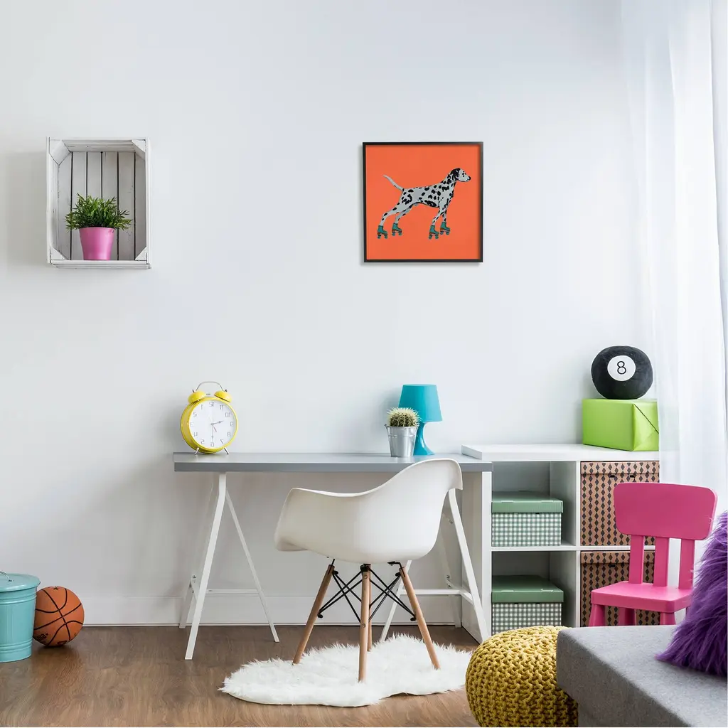 Add dimension to any room with our textured Framed Giclee Artwork. Our framed artwork is securely mounted into a 1.5-inch thick wood grain frame and ready to hang. Frames are available in three alluring styles: black, gray farmhouse and white. In addition, you should check out our oversized options if you want a statement piece. Stupell Wall Art is made in the USA.Features: Dimensions: 12 x 1.5 x 12 FramedFramed Giclee Sizes Include Standard: 12 x 1.5 x 12 Large: 17 x 1.5 x 17 Oversized: 24 x 1.5 x 24Wall Art is Ready to Hang - No Installation or Hardware Needed. For Easy Set Up Lean or Layer Artwork on Shelf or Against Wall.Our giclée prints are carefully mounted on a durable MDF backing, and then perfectly finished in a 1.5 inch thick woodgrain frame. Mounted frame colors include black, gray farmhouse and white. Made In USA.Artwork Relates To: Animal, Canine, Dog, Hound, Mammal, Pet, Dalmatian, Skating, RollerskatingDesign by Coco de Paris