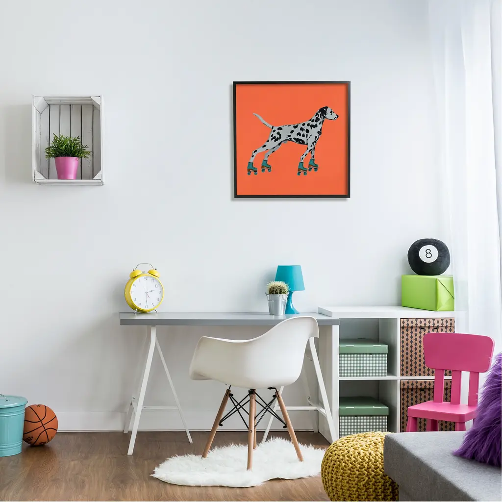 Add dimension to any room with our textured Framed Giclee Artwork. Our framed artwork is securely mounted into a 1.5-inch thick wood grain frame and ready to hang. Frames are available in three alluring styles: black, gray farmhouse and white. In addition, you should check out our oversized options if you want a statement piece. Stupell Wall Art is made in the USA.Features: Dimensions: 12 x 1.5 x 12 FramedFramed Giclee Sizes Include Standard: 12 x 1.5 x 12 Large: 17 x 1.5 x 17 Oversized: 24 x 1.5 x 24Wall Art is Ready to Hang - No Installation or Hardware Needed. For Easy Set Up Lean or Layer Artwork on Shelf or Against Wall.Our giclée prints are carefully mounted on a durable MDF backing, and then perfectly finished in a 1.5 inch thick woodgrain frame. Mounted frame colors include black, gray farmhouse and white. Made In USA.Artwork Relates To: Animal, Canine, Dog, Hound, Mammal, Pet, Dalmatian, Skating, RollerskatingDesign by Coco de Paris