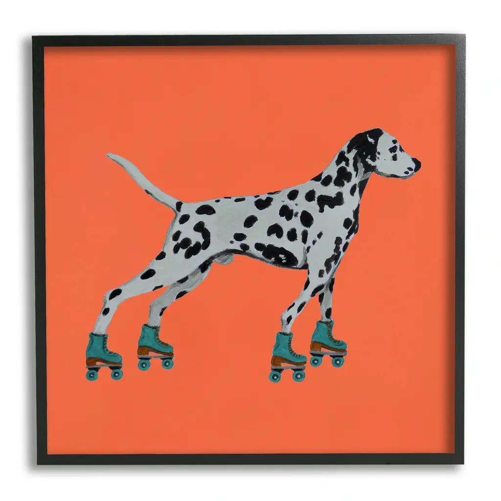 Add dimension to any room with our textured Framed Giclee Artwork. Our framed artwork is securely mounted into a 1.5-inch thick wood grain frame and ready to hang. Frames are available in three alluring styles: black, gray farmhouse and white. In addition, you should check out our oversized options if you want a statement piece. Stupell Wall Art is made in the USA.Features: Dimensions: 12 x 1.5 x 12 FramedFramed Giclee Sizes Include Standard: 12 x 1.5 x 12 Large: 17 x 1.5 x 17 Oversized: 24 x 1.5 x 24Wall Art is Ready to Hang - No Installation or Hardware Needed. For Easy Set Up Lean or Layer Artwork on Shelf or Against Wall.Our giclée prints are carefully mounted on a durable MDF backing, and then perfectly finished in a 1.5 inch thick woodgrain frame. Mounted frame colors include black, gray farmhouse and white. Made In USA.Artwork Relates To: Animal, Canine, Dog, Hound, Mammal, Pet, Dalmatian, Skating, RollerskatingDesign by Coco de Paris