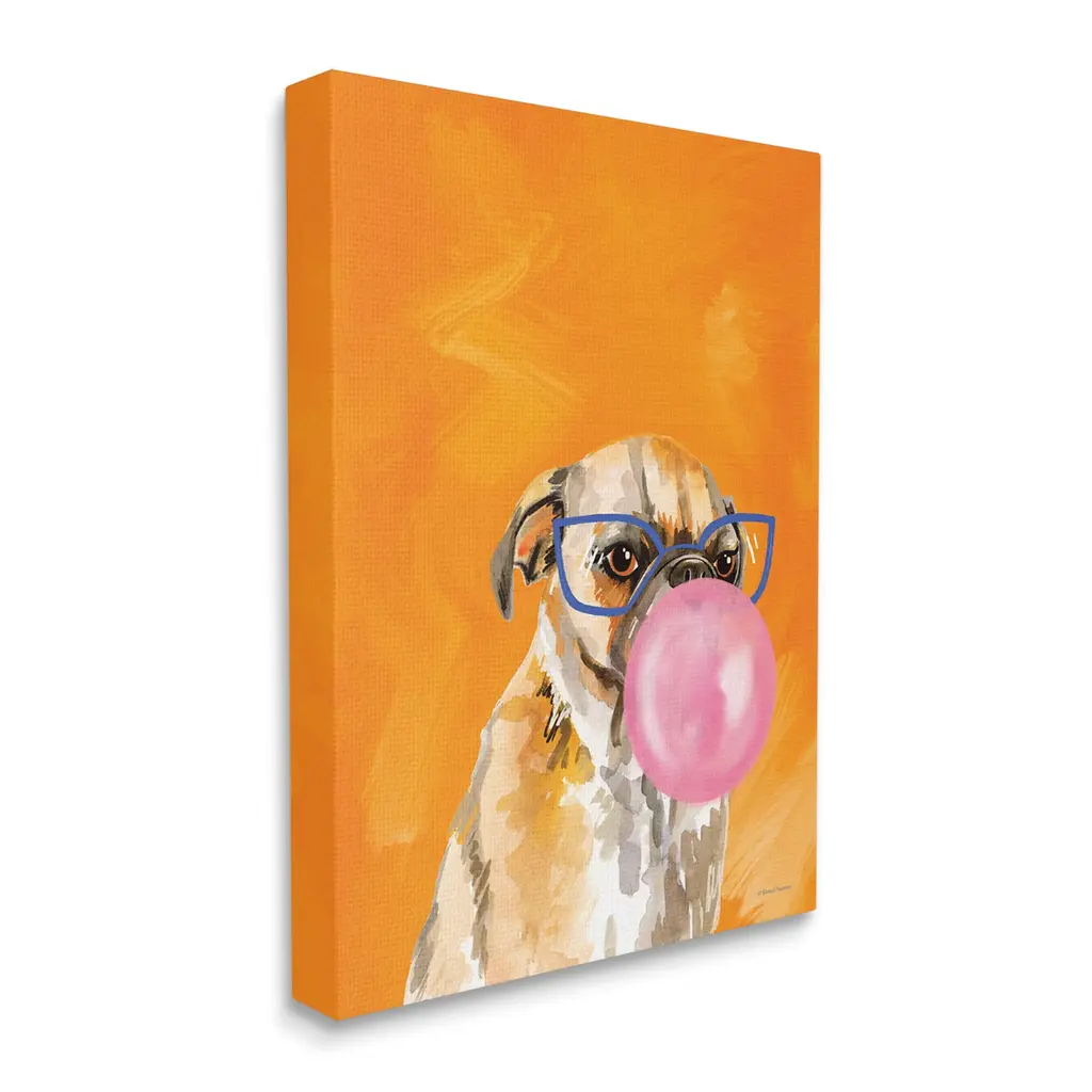 We create our stretched canvas to the highest standards. Using only the highest quality inks and canvas on Mimaki printers, we hand-cut and stretch each piece over a 1.5-inch thick wooden frame for hanging. As a result, the art comes ready to hang on the sturdy ledge with no installation required. Stupell Wall Art is made in the USA.Features: Dimensions: 16 x 1.5 x 20 InchesStretched Canvas Sizes Include Standard: 16 x 1.5 x 20 Large: 20 x 1.5 x 30 X-Large: 30 x 1.5 x 40 Oversized: 36 x 1.5 x 48Wall Art is Ready to Hang with Hardware Free Hanging. No installation required. For Easy Set Up Lean or Layer Artwork on Shelf or Against Wall.Our stretched canvas is created with the highest standards. We use only the highest quality inks and canvas on our in house Mimaki printers, and then hand cut and stretch each piece over a 1.5 inch thick wooden frame for hanging. Made In USA.Artwork Relates To: Animal, Canine, Mammal, Pet, Painting, Dog, Glasses, BubblegumDesign by Rachel Nieman