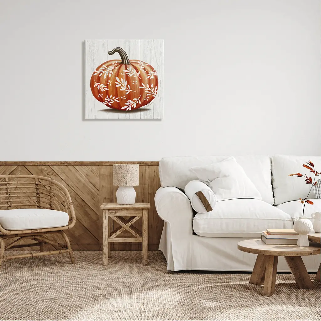 Proudly made in the USA, Our stretched canvas is created with the highest standards. We use only the highest quality inks and canvas on our in house Mimaki printers, and then hand cut and stretch each piece over a 1.5 inch thick wooden frame for hanging. The art comes ready to hang with no installation required. Not to mention, at this size, it is sure to be the focal point of any room!Features:Dimensions: 17 x 1.5 x 17 InchesStretched Canvas Sizes IncludeStandard: 17 x 1.5 x 17Large: 24 x 1.5 x 24X-Large: 30 x 1.5 x 30Oversized: 36 x 1.5 x 36Wall Art is Ready to Hang - No Installation or Hardware Needed. For Easy Set Up Lean or Layer Artwork on Shelf or Against Wall.Our stretched canvas is created with the highest standards. We use only the highest quality inks and canvas on our in house Mimaki printers, and then hand cut and stretch each piece over a 1.5 inch thick wooden frame for hanging. Made In USA.Artwork Relates To: Pumpkin; Plant; Gourd, Pattern, Botanical, LeafDesign by Elizabeth Tyndall