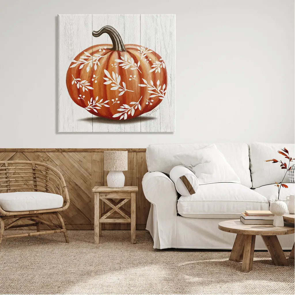 Proudly made in the USA, Our stretched canvas is created with the highest standards. We use only the highest quality inks and canvas on our in house Mimaki printers, and then hand cut and stretch each piece over a 1.5 inch thick wooden frame for hanging. The art comes ready to hang with no installation required. Not to mention, at this size, it is sure to be the focal point of any room!Features:Dimensions: 17 x 1.5 x 17 InchesStretched Canvas Sizes IncludeStandard: 17 x 1.5 x 17Large: 24 x 1.5 x 24X-Large: 30 x 1.5 x 30Oversized: 36 x 1.5 x 36Wall Art is Ready to Hang - No Installation or Hardware Needed. For Easy Set Up Lean or Layer Artwork on Shelf or Against Wall.Our stretched canvas is created with the highest standards. We use only the highest quality inks and canvas on our in house Mimaki printers, and then hand cut and stretch each piece over a 1.5 inch thick wooden frame for hanging. Made In USA.Artwork Relates To: Pumpkin; Plant; Gourd, Pattern, Botanical, LeafDesign by Elizabeth Tyndall