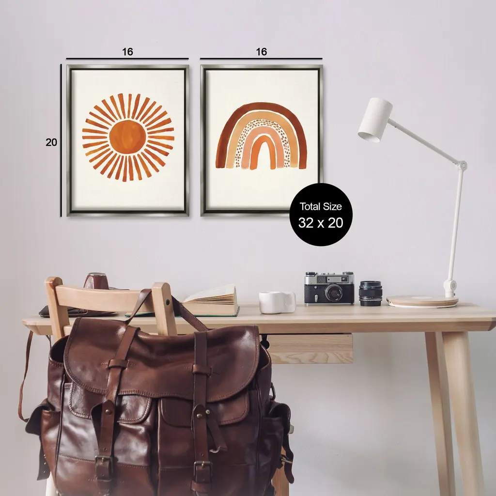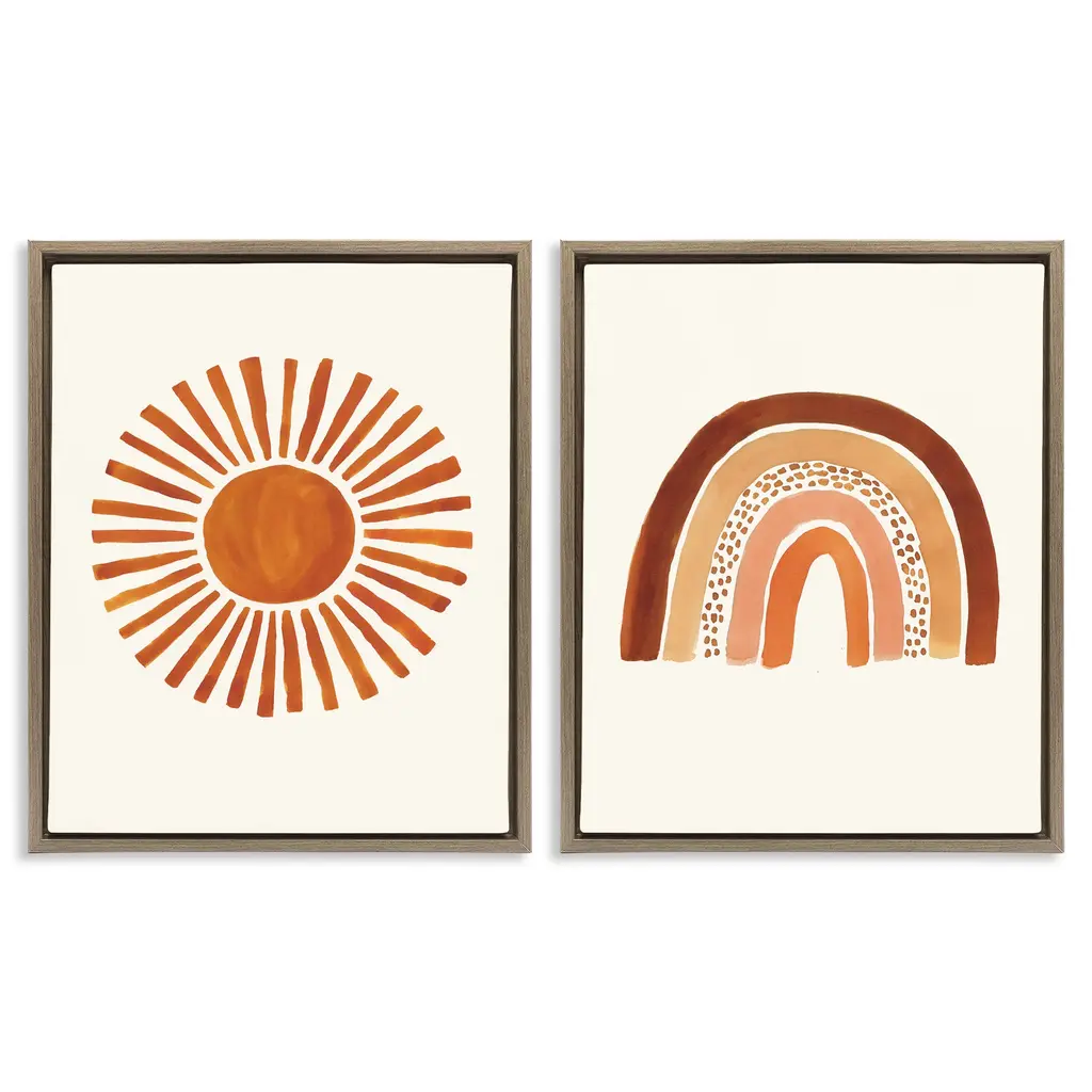 Elevate your home or office to the next level with Stupell Framed Floating Canvas Wall Art. Our premium hand-stretched canvas is mounted securely into a sturdy lightweight frame. The museum-style gap between the wrapped canvas and the box frame gives the illusion of floating artwork. Stupell Wall Art is made in the USA.Features: Dimensions: 2 Piece Set, Each Frame is 17 x 1.7 x 21Two Piece Floater Framed Canvas are available as 17x21 or 25x31 Panels. All Floater Frame Products have a 1.7" Depth.Wall Art is Ready to Hang with Hardware Free Hanging. No Installation required. For Easy Set Up Lean or Layer Artwork on Shelf or Against Wall. Artwork is Permently Fixed into the Frame.Our elevated 1.7" Thick Floating Frame is the perfect complement to our canvas style Wall Art. We use only the highest quality inks in house with industry leading printing solutions. Canvas is hand stretched over a durable wood foundation and then mounted securly into a Modern Box Frame. Made in the USA.Artwork Relates To: Boho, Rainbow, Sun, Nature, NeutralDesign by Heather McLaughlin