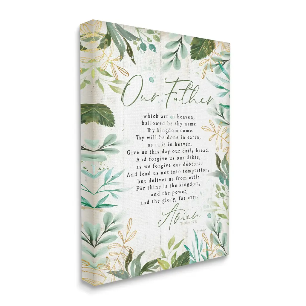 We create our stretched canvas to the highest standards. Using only the highest quality inks and canvas on Mimaki printers, we hand-cut and stretch each piece over a 1.5-inch thick wooden frame for hanging. As a result, the art comes ready to hang on the sturdy ledge with no installation required. Stupell Wall Art is made in the USA.Features: Dimensions: 16 x 1.5 x 20 InchesStretched Canvas Sizes Include Standard: 16 x 1.5 x 20 Large: 20 x 1.5 x 30 X-Large: 30 x 1.5 x 40 Oversized: 36 x 1.5 x 48Wall Art is Ready to Hang - No Installation or Hardware Needed. For Easy Set Up Lean or Layer Artwork on Shelf or Against Wall.Our stretched canvas is created with the highest standards. We use only the highest quality inks and canvas on our in house Mimaki printers, and then hand cut and stretch each piece over a 1.5 inch thick wooden frame for hanging. Made In USA.Artwork Relates To: Herbal, Herbs, Plant, Leaf, Botanical, Religious, Prayer, Our FatherDesign by Jennifer Pugh