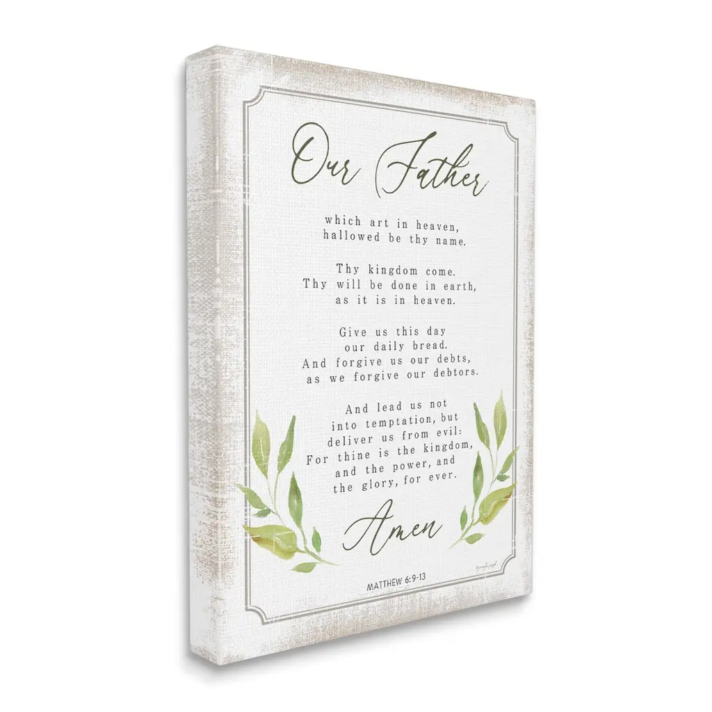 We create our stretched canvas to the highest standards. Using only the highest quality inks and canvas on Mimaki printers, we hand-cut and stretch each piece over a 1.5-inch thick wooden frame for hanging. As a result, the art comes ready to hang on the sturdy ledge with no installation required. Stupell Wall Art is made in the USA.Features: Dimensions: 16 x 1.5 x 20 InchesStretched Canvas Sizes Include Standard: 16 x 1.5 x 20 Large: 20 x 1.5 x 30 X-Large: 30 x 1.5 x 40 Oversized: 36 x 1.5 x 48Wall Art is Ready to Hang - No Installation or Hardware Needed. For Easy Set Up Lean or Layer Artwork on Shelf or Against Wall.Our stretched canvas is created with the highest standards. We use only the highest quality inks and canvas on our in house Mimaki printers, and then hand cut and stretch each piece over a 1.5 inch thick wooden frame for hanging. Made In USA.Artwork Relates To: Herbal, Herbs, Plant, Leaf, Botanical, Religious, Christian, Prayer, Our FatherDesign by Jennifer Pugh