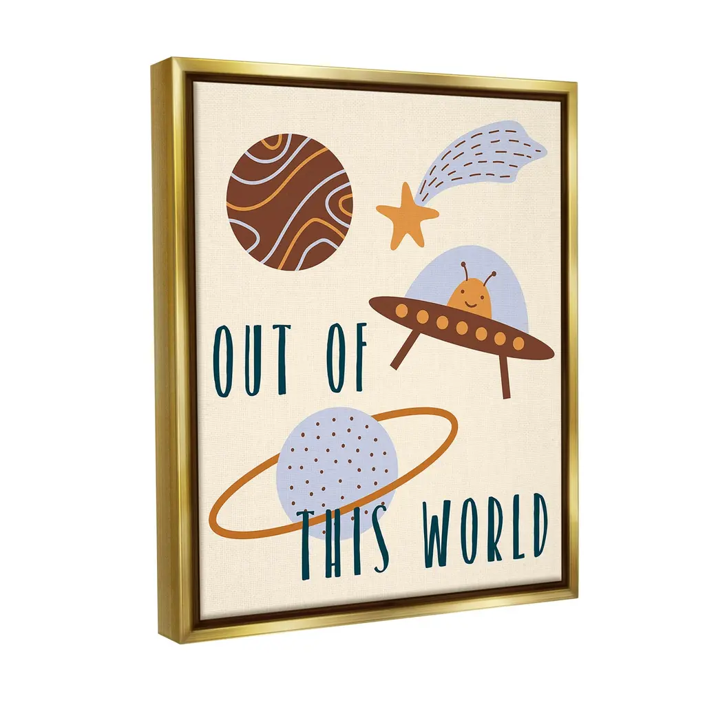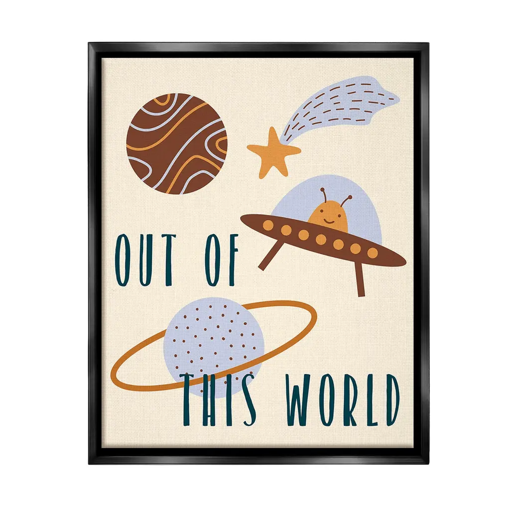 Elevate your home or office to the next level with Stupell Framed Floating Canvas Wall Art. Our premium hand-stretched canvas is mounted securely into a sturdy lightweight frame. The museum-style gap between the wrapped canvas and the box frame gives the illusion of floating artwork. Stupell Wall Art is made in the USA.Features: Dimensions: 17 x 1.7 x 21 Frame, 16 x 1.5 x 20 Canvas ArtFloating Frame Canvas Products are available in sizes 17"x21" and 25"x31". All Floating Frame Canvas Products have a 1.7" Depth.Wall Art is Ready to Hang with Hardware Free Hanging. No Installation required. For Easy Set Up Lean or Layer Artwork on Shelf or Against Wall. Artwork is Permently Fixed into the Frame.Our elevated 1.7" Thick Floating Frame is the perfect complement to our canvas style Wall Art. We use only the highest quality inks in house with industry leading printing solutions. Canvas is hand stretched over a durable wood foundation and then mounted securly into a Modern Box Frame. Made in the USA.Artwork Relates To: Alien, Outer Space, Spaceship, UFO, Stars, Minimal, Whimsical, Planet, Out of this WorldDesign by Lil' Rue