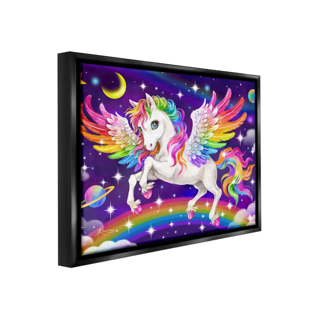 Elevate your home or office to the next level with Stupell Framed Floating Canvas Wall Art. Our premium hand-stretched canvas is mounted securely into a sturdy lightweight frame. The museum-style gap between the wrapped canvas and the box frame gives the illusion of floating artwork. Stupell Wall Art is made in the USA.Features: Dimensions: 21 x 1.7 x 17 Frame, 20 x 1.5 x 16 Canvas ArtFloating Frame Canvas Products are available in sizes 21"x17" and 31"x25". All Floating Frame Canvas Products have a 1.7" Depth.Wall Art is Ready to Hang with Hardware Free Hanging. No Installation required. For Easy Set Up Lean or Layer Artwork on Shelf or Against Wall. Artwork is Permently Fixed into the Frame.Our elevated 1.7" Thick Floating Frame is the perfect complement to our canvas style Wall Art. We use only the highest quality inks in house with industry leading printing solutions. Canvas is hand stretched over a durable wood foundation and then mounted securly into a Modern Box Frame. Made in the USA.Artwork Relates To: Modern, Animal, Horse, Unicorn, Fantasy, Rainbow, Stars, Pattern, Outer Space, Clouds, Planet, MoonDesign by Kayomi Harai