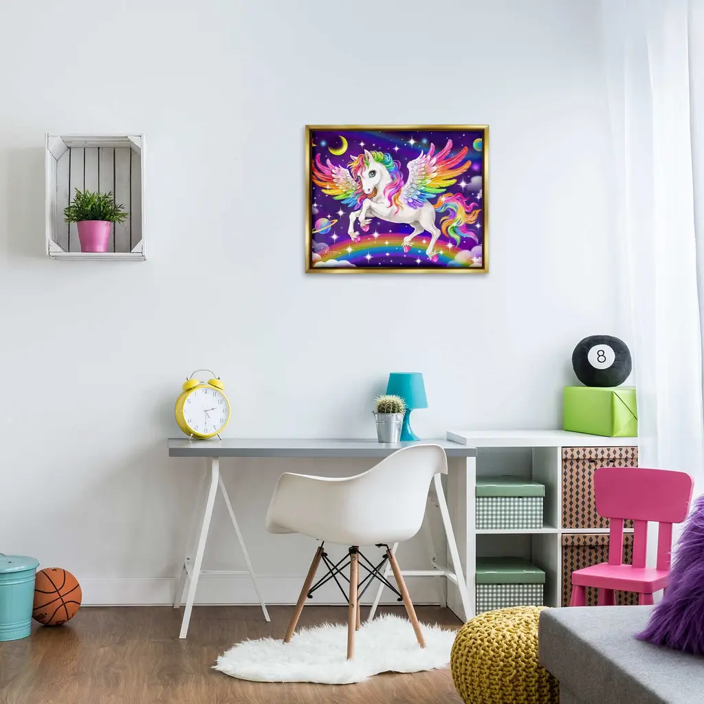 Elevate your home or office to the next level with Stupell Framed Floating Canvas Wall Art. Our premium hand-stretched canvas is mounted securely into a sturdy lightweight frame. The museum-style gap between the wrapped canvas and the box frame gives the illusion of floating artwork. Stupell Wall Art is made in the USA.Features: Dimensions: 21 x 1.7 x 17 Frame, 20 x 1.5 x 16 Canvas ArtFloating Frame Canvas Products are available in sizes 21"x17" and 31"x25". All Floating Frame Canvas Products have a 1.7" Depth.Wall Art is Ready to Hang with Hardware Free Hanging. No Installation required. For Easy Set Up Lean or Layer Artwork on Shelf or Against Wall. Artwork is Permently Fixed into the Frame.Our elevated 1.7" Thick Floating Frame is the perfect complement to our canvas style Wall Art. We use only the highest quality inks in house with industry leading printing solutions. Canvas is hand stretched over a durable wood foundation and then mounted securly into a Modern Box Frame. Made in the USA.Artwork Relates To: Modern, Animal, Horse, Unicorn, Fantasy, Rainbow, Stars, Pattern, Outer Space, Clouds, Planet, MoonDesign by Kayomi Harai