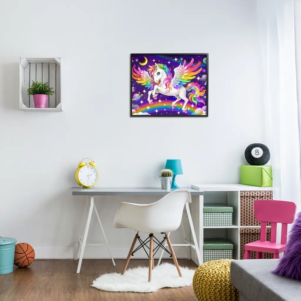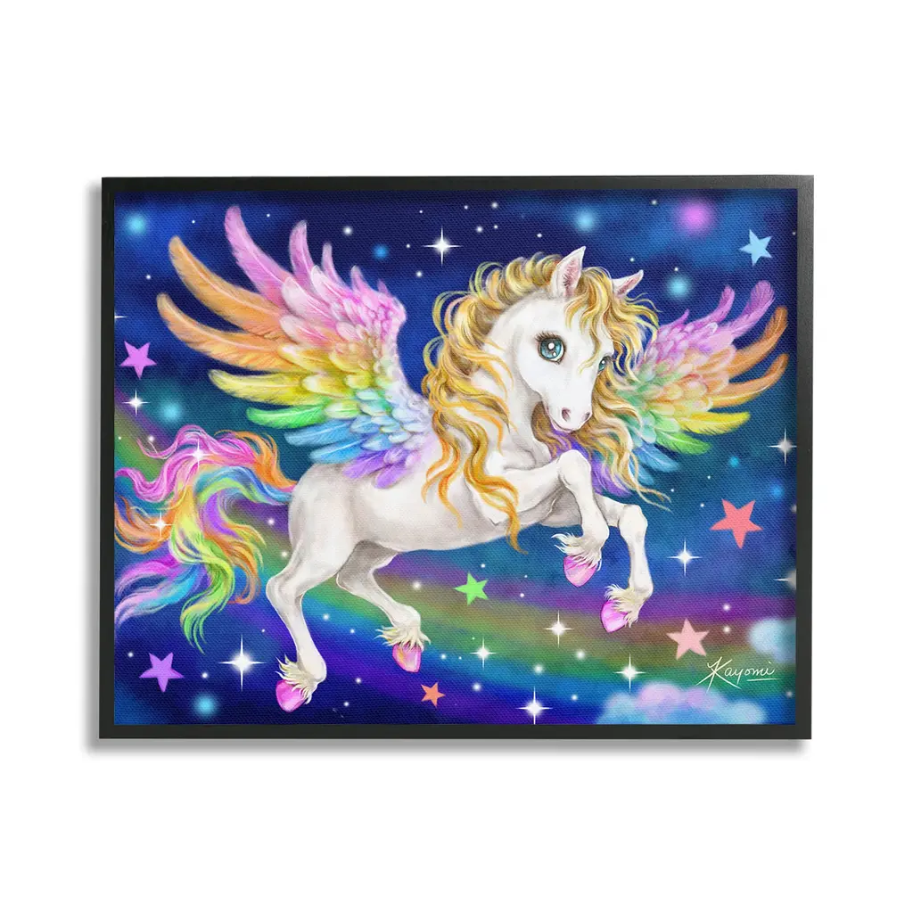 Add dimension to any room with our textured Framed Giclee Artwork. Our framed artwork is securely mounted into a 1.5-inch thick wood grain frame and ready to hang. Frames are available in three alluring styles: black, gray farmhouse and white. In addition, you should check out our oversized options if you want a statement piece. Stupell Wall Art is made in the USA.Features: Dimensions: 14 x 1.5 x 11 FramedFramed Giclee Products are available in the sizes 14"x11", 20"x16" or 30"x24". All Framed Giclee Products have a 1.5" Depth. Wall Art is Ready to Hang with Hardware Free Hanging. No installation required. For Easy Set Up Lean or Layer Artwork on Shelf or Against Wall.Our giclée prints are carefully mounted on a durable MDF backing, and then perfectly finished in a 1.5 inch thick woodgrain frame. Mounted frame colors include black, gray farmhouse and white. Made In USA.Artwork Relates To: Modern, Animal, Horse, Unicorn, Fantasy, Rainbow, Stars, Pattern, Outer Space, Clouds, Planet, MoonDesign by Kayomi Harai