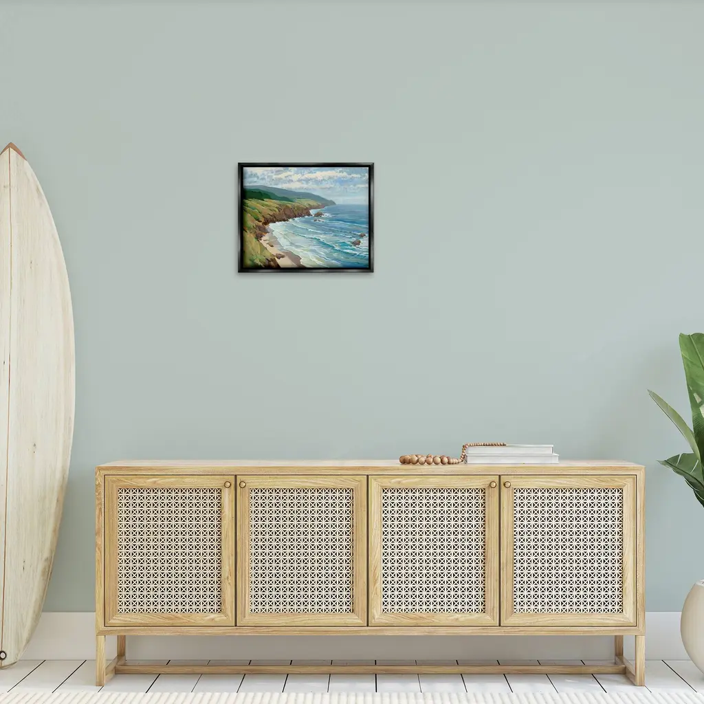 Elevate your home or office to the next level with Stupell Framed Floating Canvas Wall Art. Our premium hand-stretched canvas is mounted securely into a sturdy lightweight frame. The museum-style gap between the wrapped canvas and the box frame gives the illusion of floating artwork. Stupell Wall Art is made in the USA.Features: Dimensions: 21 x 1.7 x 17 Frame, 20 x 1.5 x 16 Canvas ArtFloating Frame Canvas Products are available in sizes 21"x17" and 31"x25". All Floating Frame Canvas Products have a 1.7" Depth.Wall Art is Ready to Hang with Hardware Free Hanging. No Installation required. For Easy Set Up Lean or Layer Artwork on Shelf or Against Wall. Artwork is Permently Fixed into the Frame.Our elevated 1.7" Thick Floating Frame is the perfect complement to our canvas style Wall Art. We use only the highest quality inks in house with industry leading printing solutions. Canvas is hand stretched over a durable wood foundation and then mounted securly into a Modern Box Frame. Made in the USA.Artwork Relates To: Nature, Water, Sea, Painting, Shoreline, Coast, Beach, Scenery, Landscape, Sea Waves, Cove, CliffDesign by Scott Brems