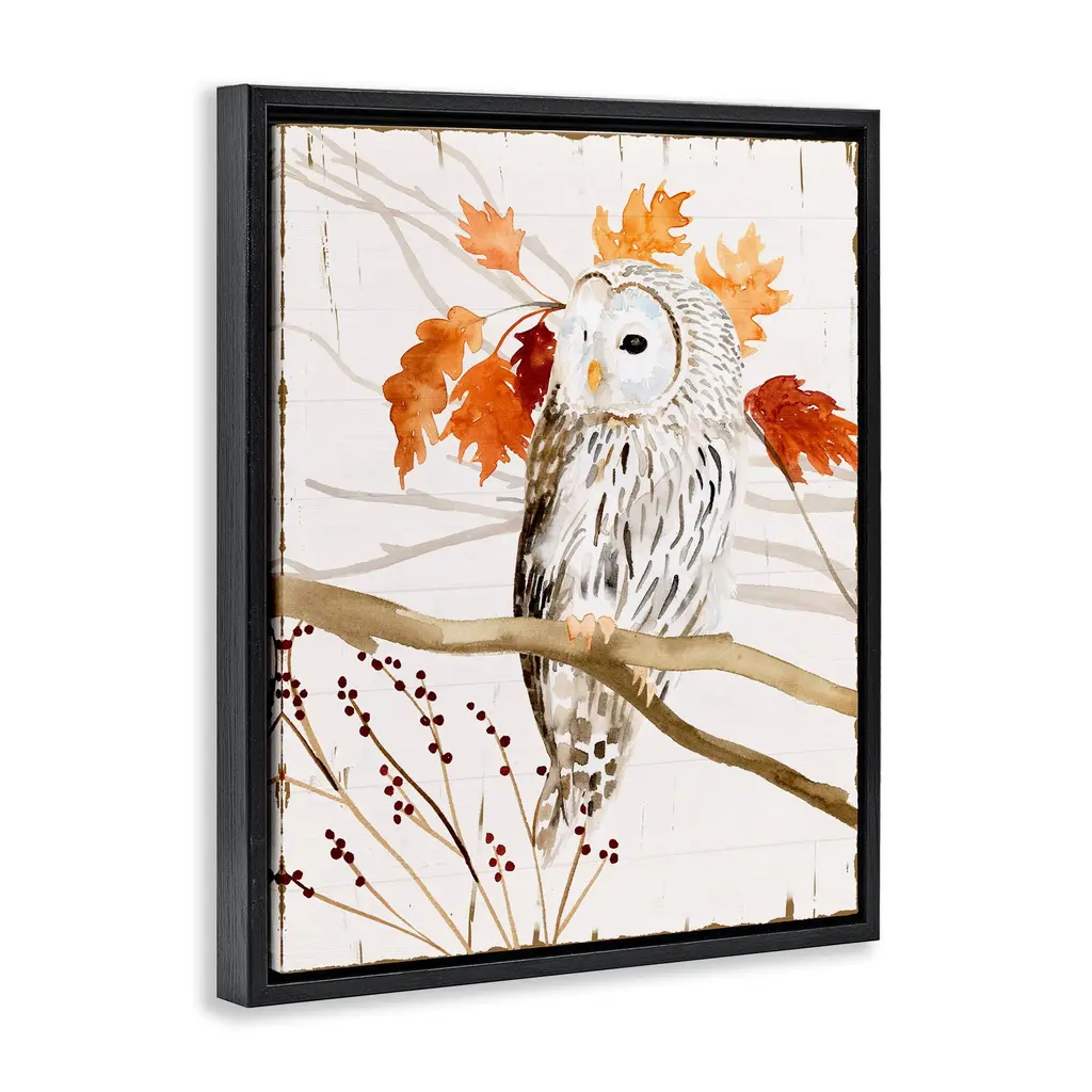 Elevate your home or office to the next level with Stupell Framed Floating Canvas Wall Art. Our premium hand-stretched canvas is mounted securely into a sturdy lightweight frame. The museum-style gap between the wrapped canvas and the box frame gives the illusion of floating artwork. Stupell Wall Art is made in the USA.Features: Dimensions: 17 x 1.7 x 21 Frame, 16 x 1.5 x 20 Canvas ArtFloating Frame Canvas Products are available in sizes 17"x21" and 25"x31". All Floating Frame Canvas Products have a 1.7" Depth.Wall Art is Ready to Hang with Hardware Free Hanging. No Installation required. For Easy Set Up Lean or Layer Artwork on Shelf or Against Wall. Artwork is Permently Fixed into the Frame.Our elevated 1.7" Thick Floating Frame is the perfect complement to our canvas style Wall Art. We use only the highest quality inks in house with industry leading printing solutions. Canvas is hand stretched over a durable wood foundation and then mounted securly into a Modern Box Frame. Made in the USA.Artwork Relates To: Animal, Bird, Owl, Forest, Woodland, Fall, Autumn, Leaf, Branch, BotanicalDesign by Victoria Borges