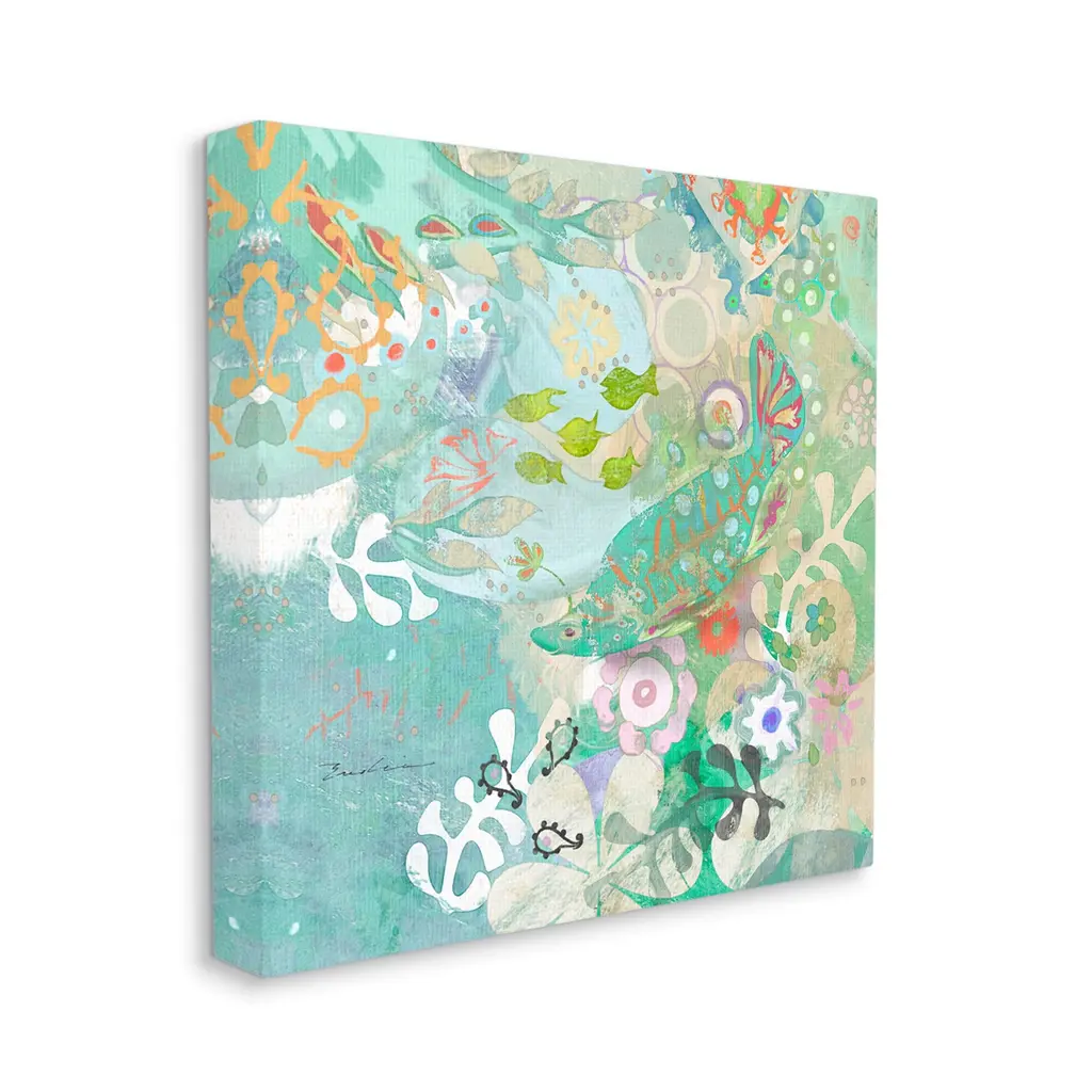We create our stretched canvas to the highest standards. Using only the highest quality inks and canvas on Mimaki printers, we hand-cut and stretch each piece over a 1.5-inch thick wooden frame for hanging. As a result, the art comes ready to hang on the sturdy ledge with no installation required. Stupell Wall Art is made in the USA.Features: Dimensions: 17 x 1.5 x 17 InchesStretched Canvas Sizes Include Standard: 17 x 1.5 x 17 Large: 24 x 1.5 x 24 X-Large: 30 x 1.5 x 30 Oversized: 36 x 1.5 x 36Wall Art is Ready to Hang with Hardware Free Hanging. No installation required. For Easy Set Up Lean or Layer Artwork on Shelf or Against Wall.Our stretched canvas is created with the highest standards. We use only the highest quality inks and canvas on our in house Mimaki printers, and then hand cut and stretch each piece over a 1.5 inch thick wooden frame for hanging. Made In USA.Artwork Relates To: Pattern, Collage, Floral, Animal, Fish, Sea, ModernDesign by Evelia Designs