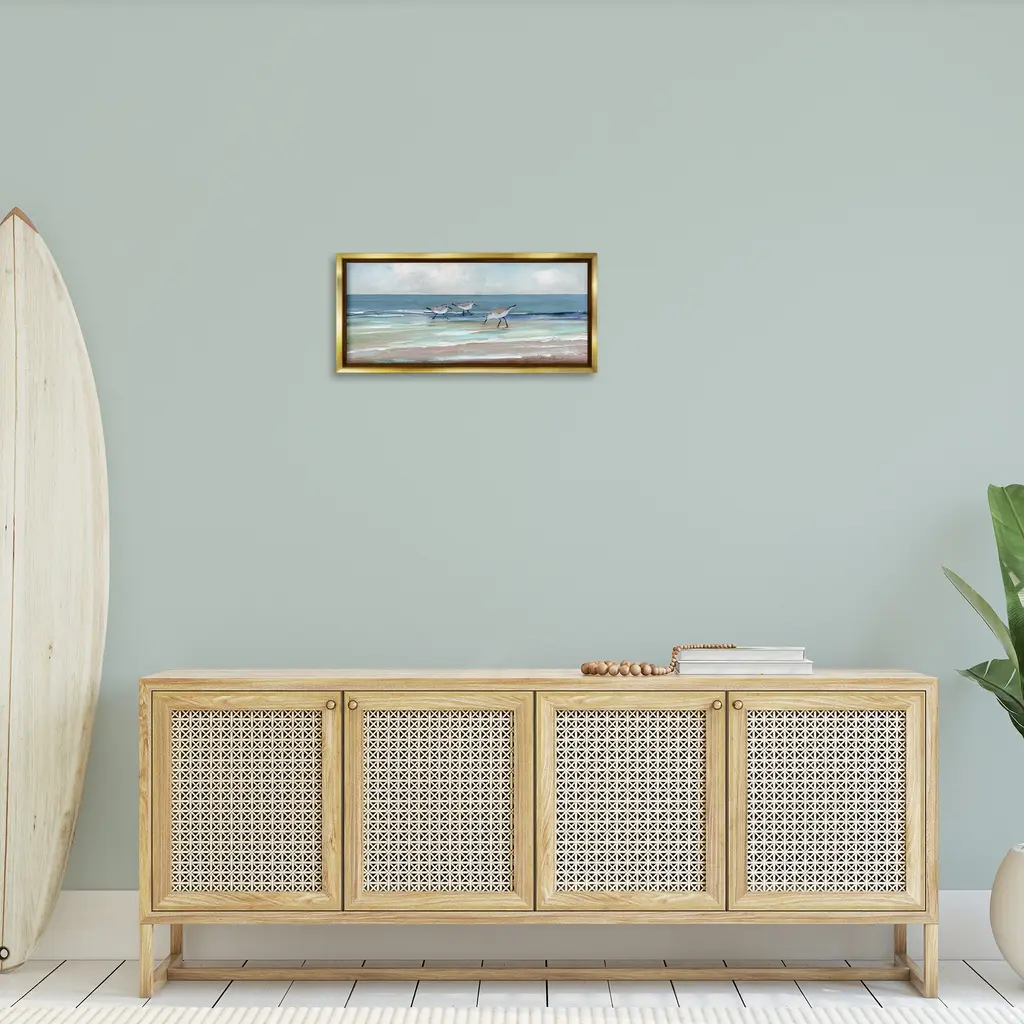 Elevate your home or office to the next level with Stupell Framed Floating Canvas Wall Art. Our premium hand-stretched canvas is mounted securely into a sturdy lightweight frame. The museum-style gap between the wrapped canvas and the box frame gives the illusion of floating artwork. Stupell Wall Art is made in the USA.Features: Dimensions: 25 x 1.7 x 11 Frame, 24 x 1.5 x 10 Canvas ArtFloating Frame Canvas Products are available in sizes 25"x11" and 31"x14". All Floating Frame Canvas Products have a 1.7" Depth.Wall Art is Ready to Hang with Hardware Free Hanging. No Installation required. For Easy Set Up Lean or Layer Artwork on Shelf or Against Wall. Artwork is Permently Fixed into the Frame.Our elevated 1.7" Thick Floating Frame is the perfect complement to our canvas style Wall Art. We use only the highest quality inks in house with industry leading printing solutions. Canvas is hand stretched over a durable wood foundation and then mounted securly into a Modern Box Frame. Made in the USA.Artwork Relates To: Bird, Animal, Painting, Shoreline, Water, Sea, Ocean, Nature, Coast, Sandpiper Design by Sally Swatland