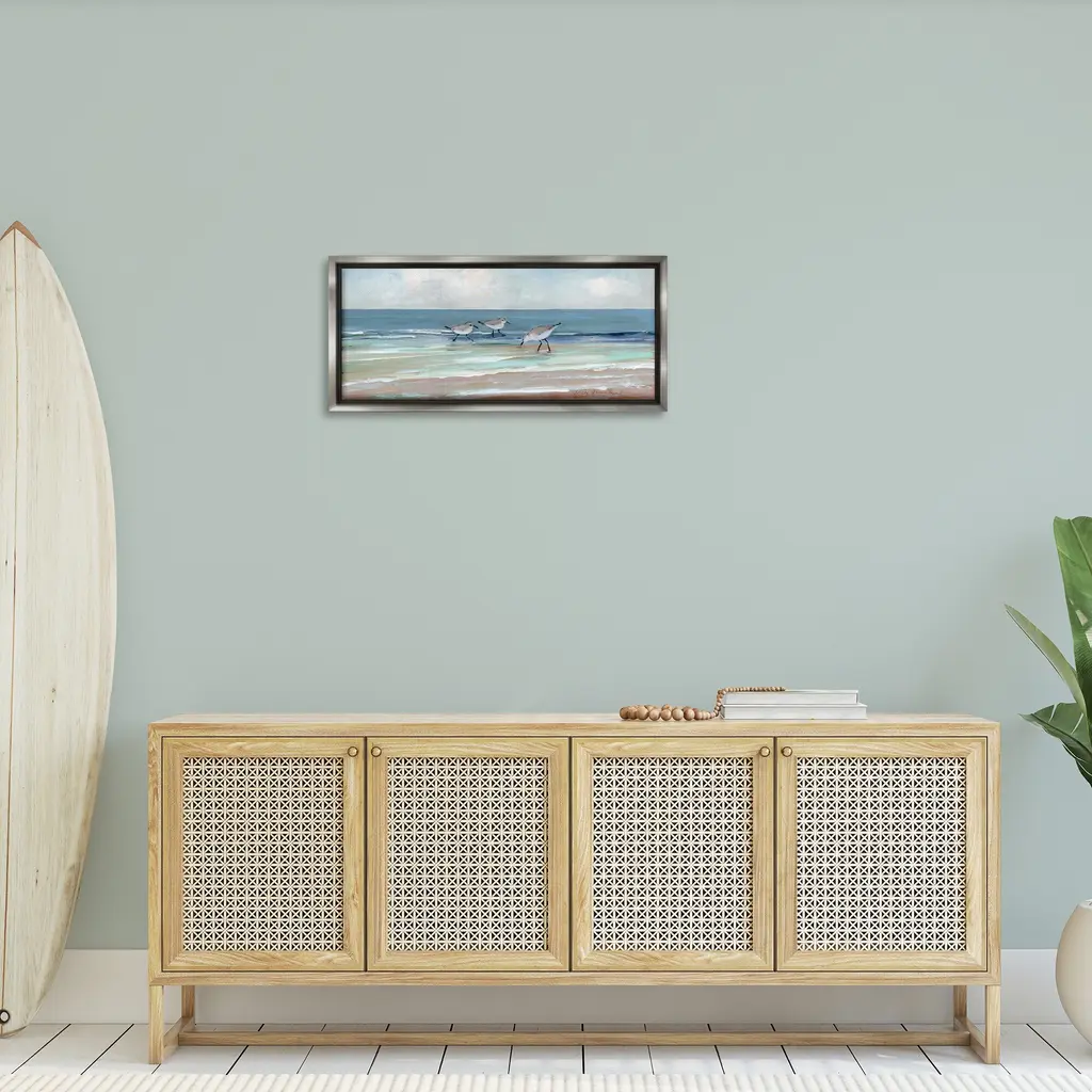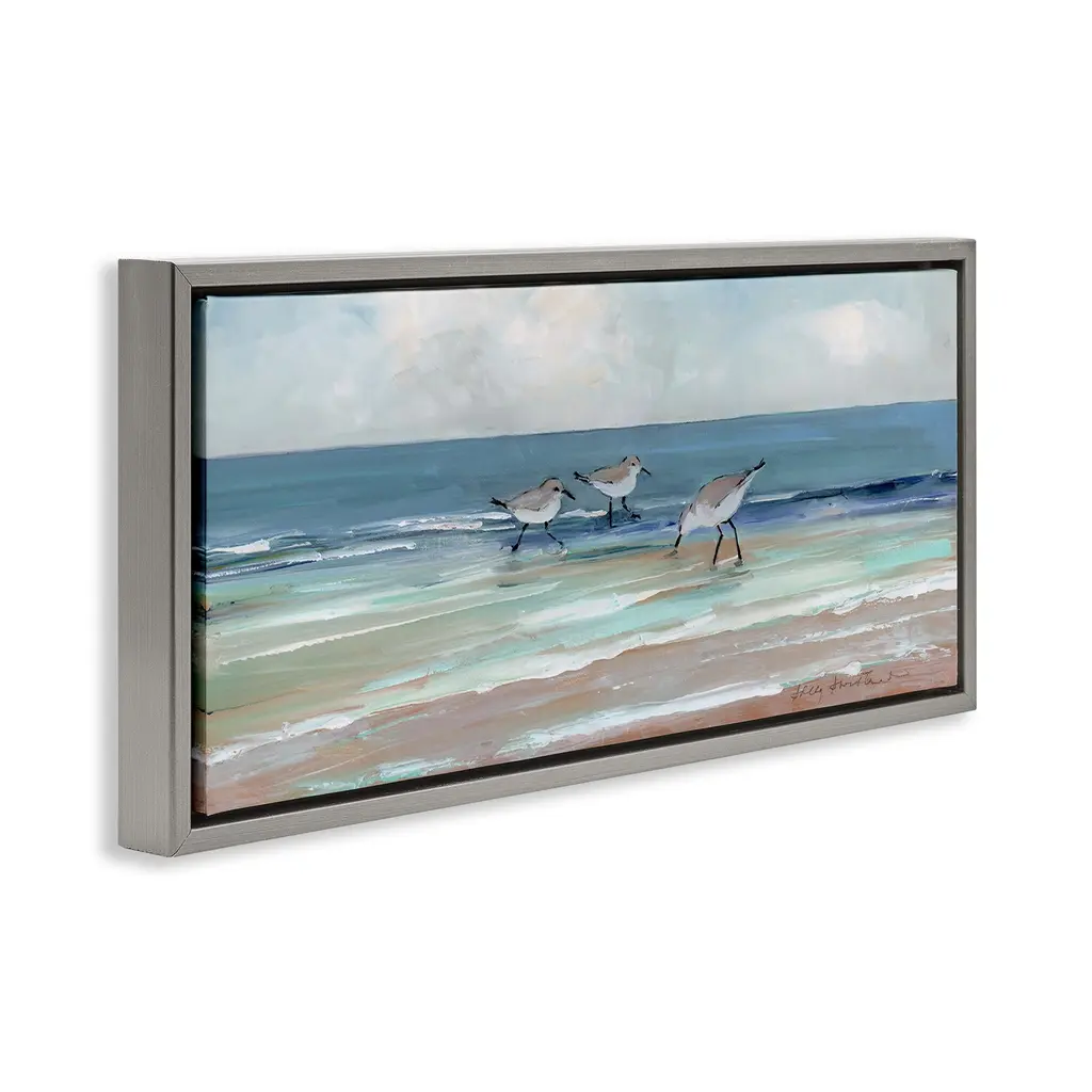 Elevate your home or office to the next level with Stupell Framed Floating Canvas Wall Art. Our premium hand-stretched canvas is mounted securely into a sturdy lightweight frame. The museum-style gap between the wrapped canvas and the box frame gives the illusion of floating artwork. Stupell Wall Art is made in the USA.Features: Dimensions: 25 x 1.7 x 11 Frame, 24 x 1.5 x 10 Canvas ArtFloating Frame Canvas Products are available in sizes 25"x11" and 31"x14". All Floating Frame Canvas Products have a 1.7" Depth.Wall Art is Ready to Hang with Hardware Free Hanging. No Installation required. For Easy Set Up Lean or Layer Artwork on Shelf or Against Wall. Artwork is Permently Fixed into the Frame.Our elevated 1.7" Thick Floating Frame is the perfect complement to our canvas style Wall Art. We use only the highest quality inks in house with industry leading printing solutions. Canvas is hand stretched over a durable wood foundation and then mounted securly into a Modern Box Frame. Made in the USA.Artwork Relates To: Bird, Animal, Painting, Shoreline, Water, Sea, Ocean, Nature, Coast, Sandpiper Design by Sally Swatland