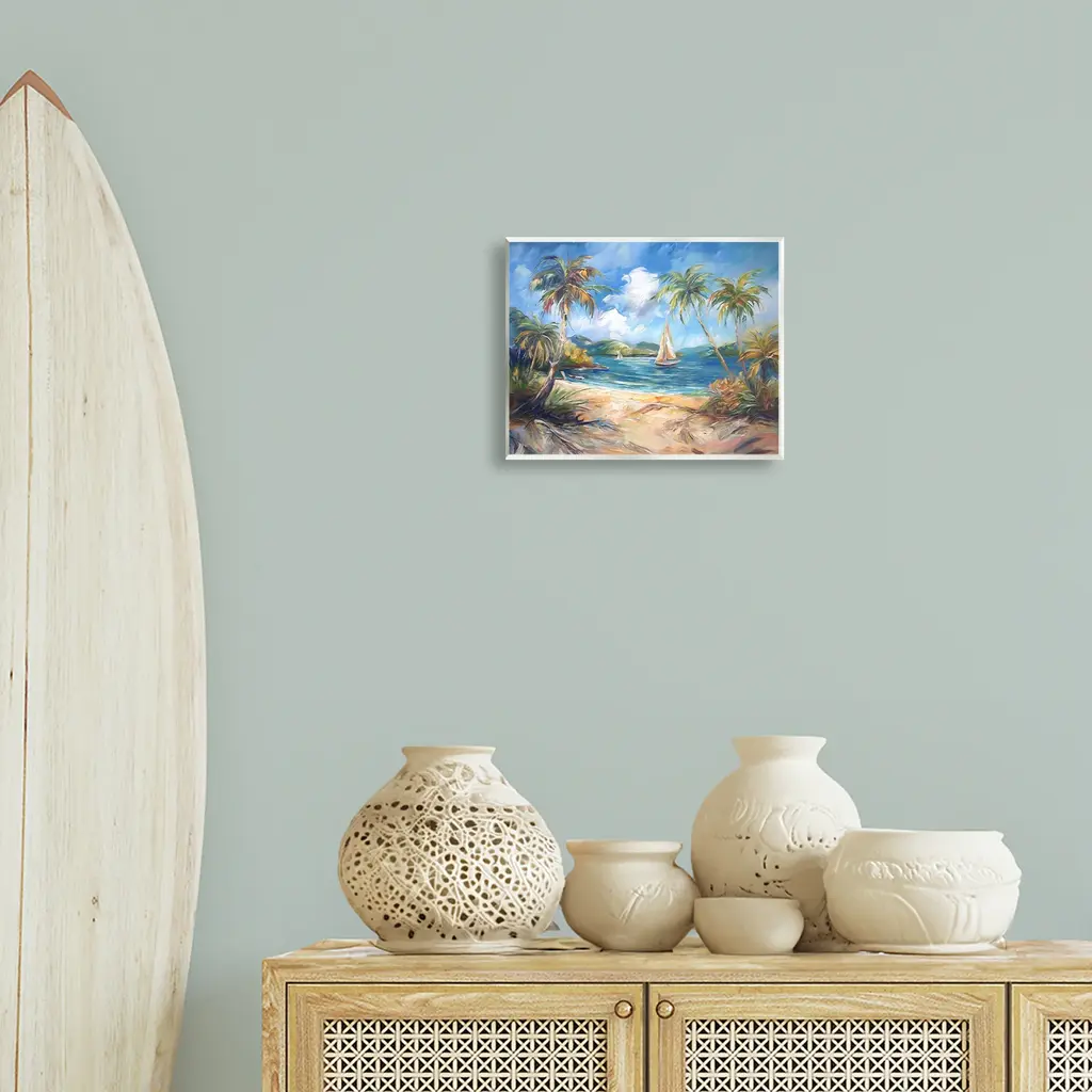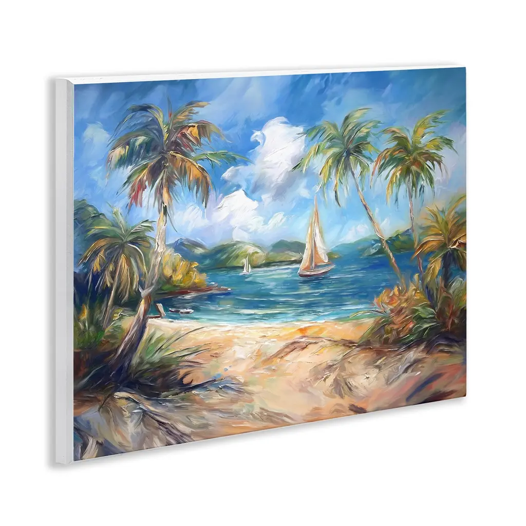 Our wall plaques start as high-quality lithograph prints mounted on durable 0.5-inch thick MDF wood. Each piece is hand finished and comes with a fresh layer of white foil on the sides to give it a crisp, clean look. Plaques arrive ready to hang without installation and come with removable plastic corners to keep them from damage in transit. Stupell Wall Art is made in the USA.Features: Dimensions: 14 x 0.5 x 11 InchesWall Art is Ready to Hang with Hardware Free Hanging. No installation required. For Easy Set Up Lean or Layer Artwork on Shelf or Against Wall.All of our wall plaques start off as high quality lithograph prints that are then mounted on durable 0.5 inch thick MDF wood. Each piece is hand finished and comes with a fresh layer of foil on the sides to give it a crisp clean look. Made In USA.Artwork Relates To: Summer, Nature, Tropical, Painting, Sea, Water, Boat, Sailboat, Palm Tree, BeachDesign by Ramona Murdock