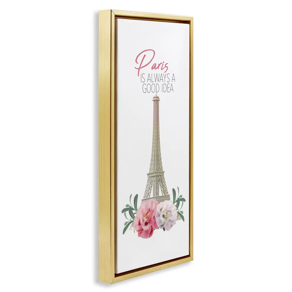 Elevate your home or office to the next level with Stupell Framed Floating Canvas Wall Art. Our premium hand-stretched canvas is mounted securely into a sturdy lightweight frame. The museum-style gap between the wrapped canvas and the box frame gives the illusion of floating artwork. Stupell Wall Art is made in the USA.Features: Dimensions: 11 x 1.7 x 25 Frame, 10 x 1.5 x 24 Canvas ArtFloating Frame Canvas Products are available in sizes 11"x25" and 14"x31". All Floating Frame Canvas Products have a 1.7" Depth.Wall Art is Ready to Hang with Hardware Free Hanging. No Installation required. For Easy Set Up Lean or Layer Artwork on Shelf or Against Wall. Artwork is Permently Fixed into the Frame.Our elevated 1.7" Thick Floating Frame is the perfect complement to our canvas style Wall Art. We use only the highest quality inks in house with industry leading printing solutions. Canvas is hand stretched over a durable wood foundation and then mounted securly into a Modern Box Frame. Made in the USA.Artwork Relates To: Glam, Travel, Paris, France, FloralDesign by Kim Allen
